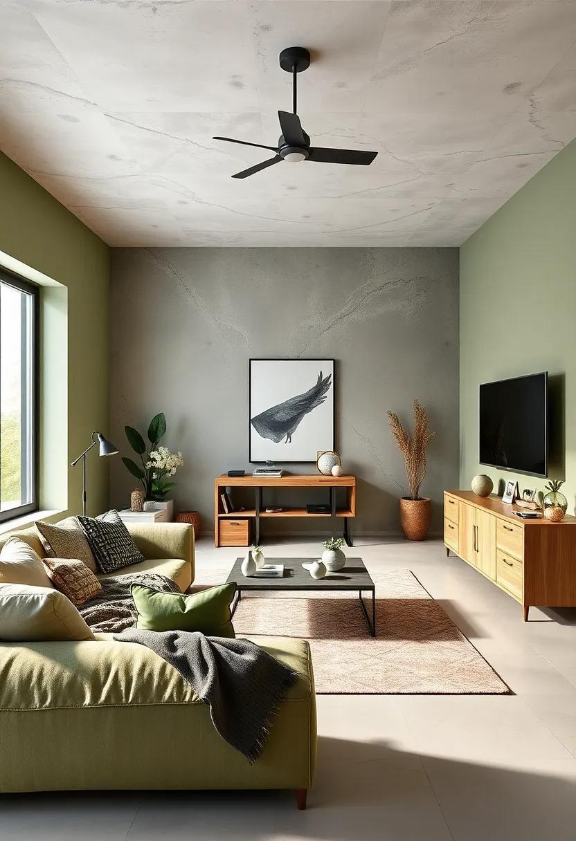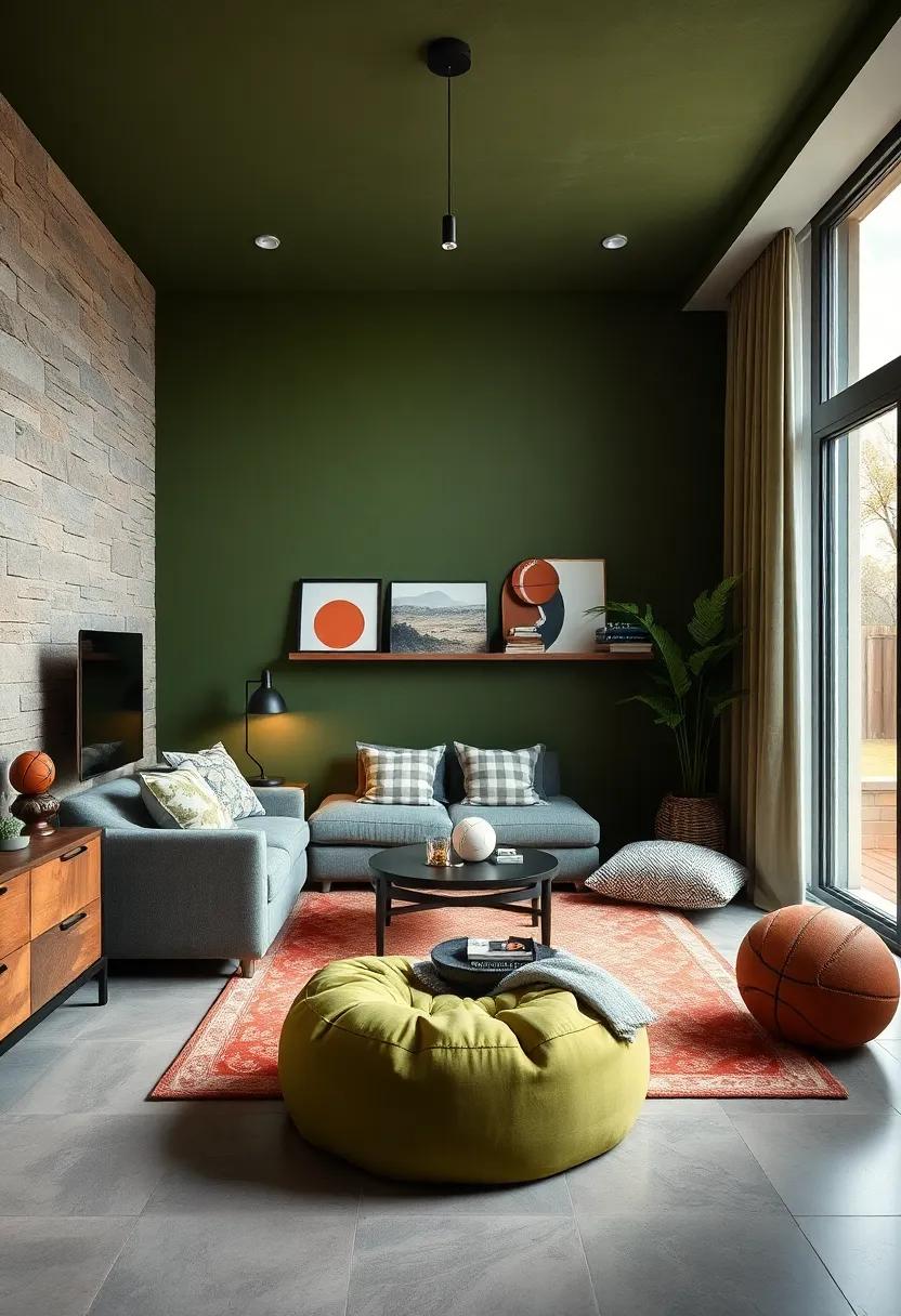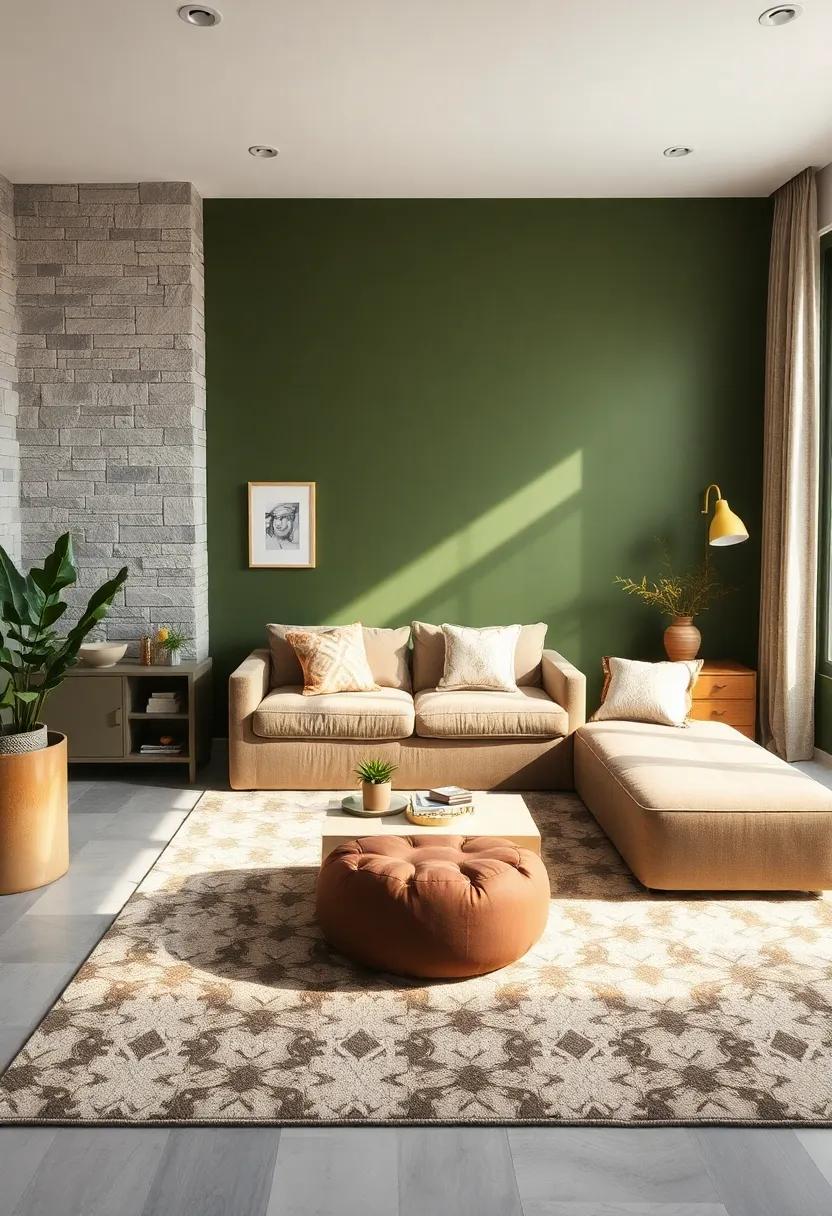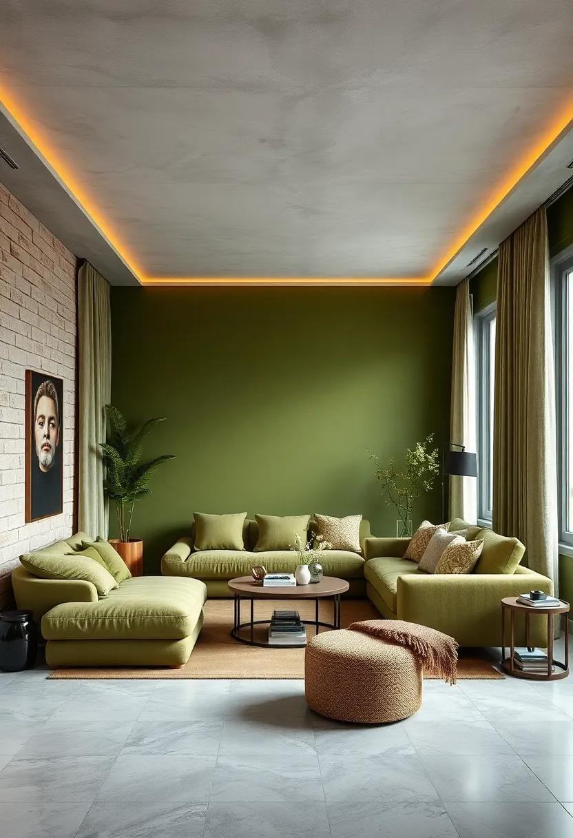 - Natural Elements: A potted plant or a small indoor tree provides a touch of nature, breaking up the olive green with vibrant greens or floral tones.