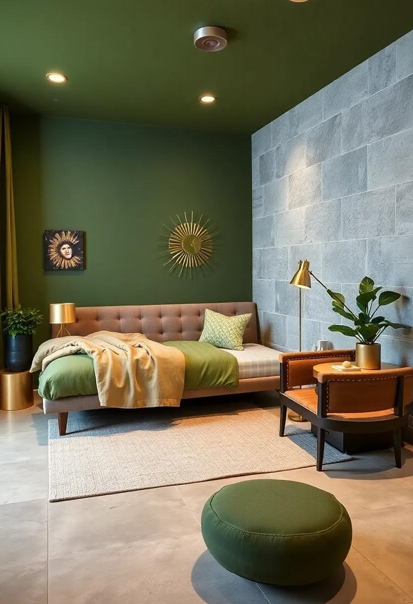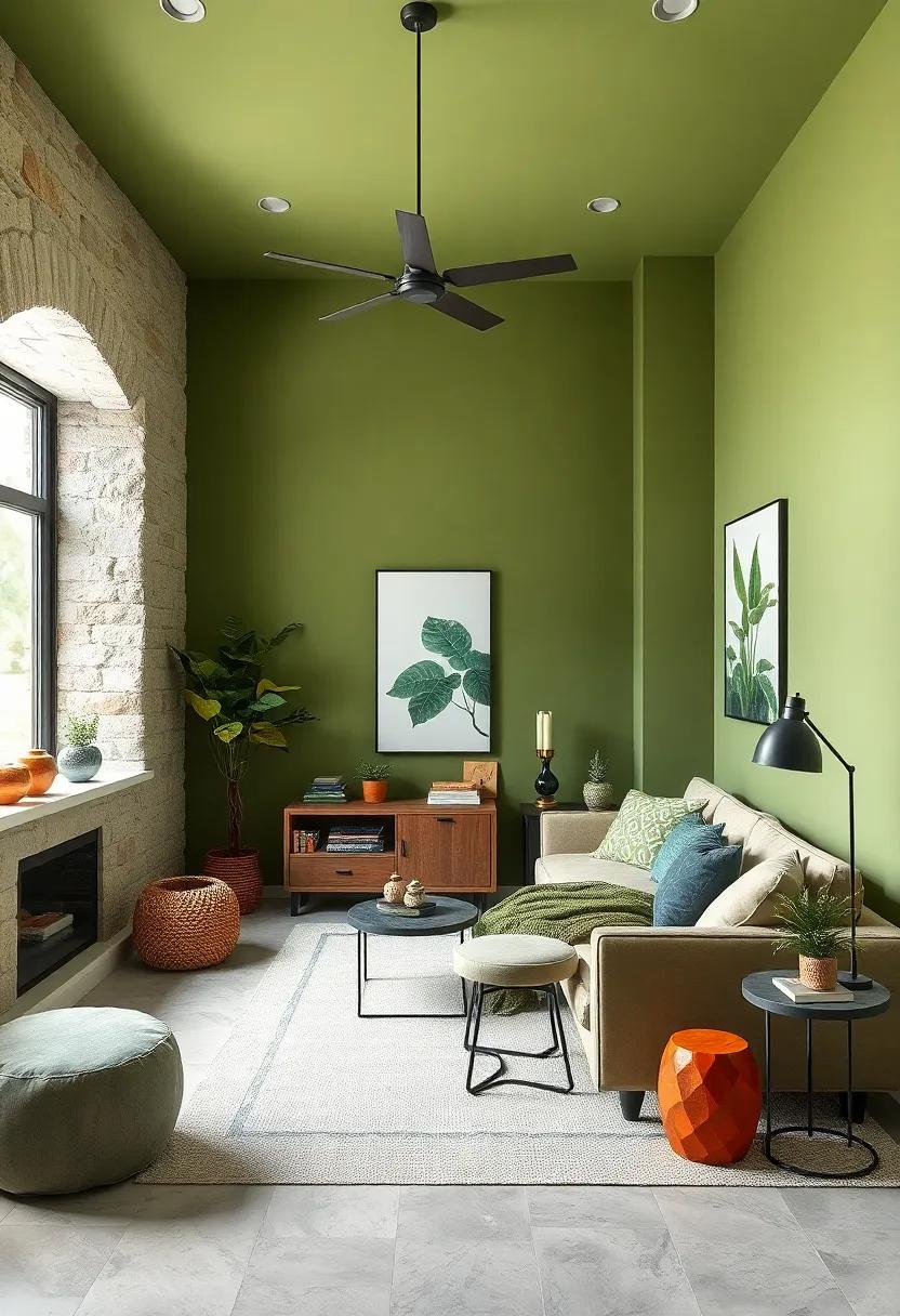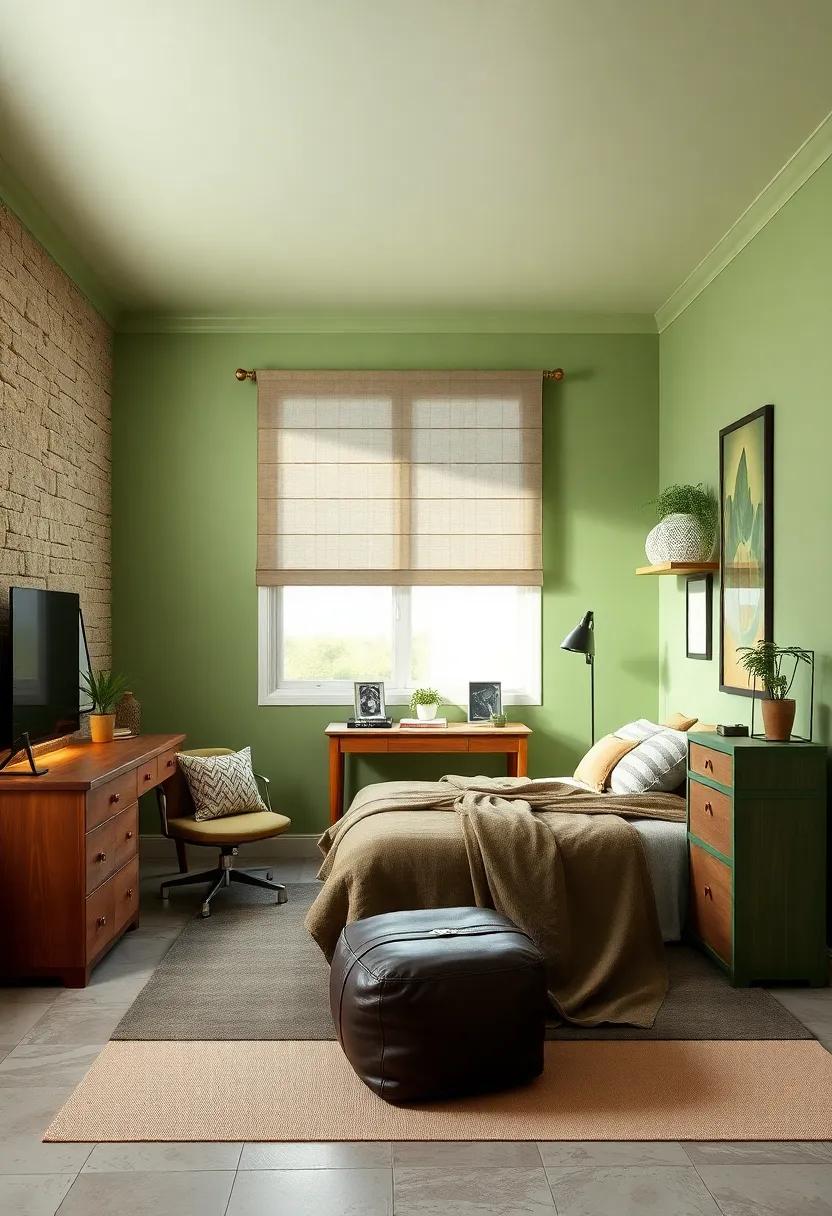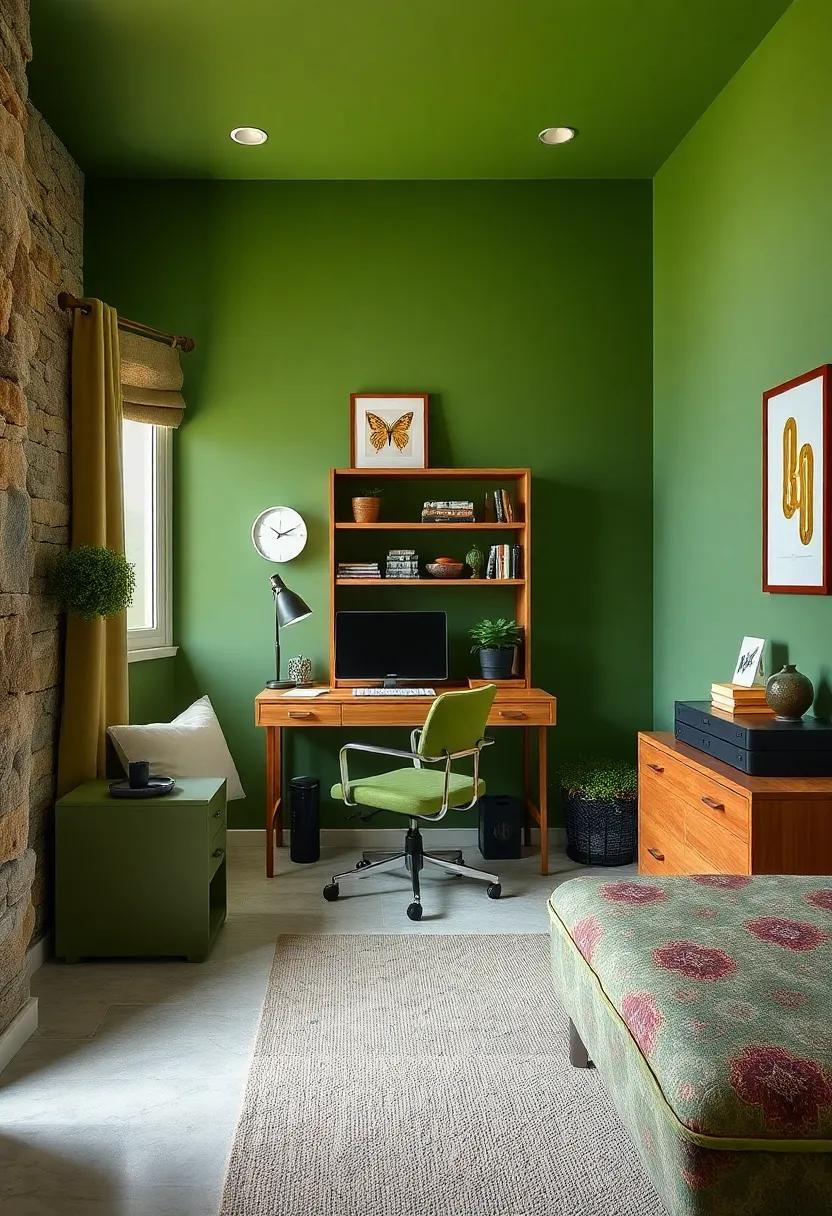 Embrace Nature with olive Green Walls: Paint the walls a soothing olive green to create a calming backdrop that encourages relaxation and creativity