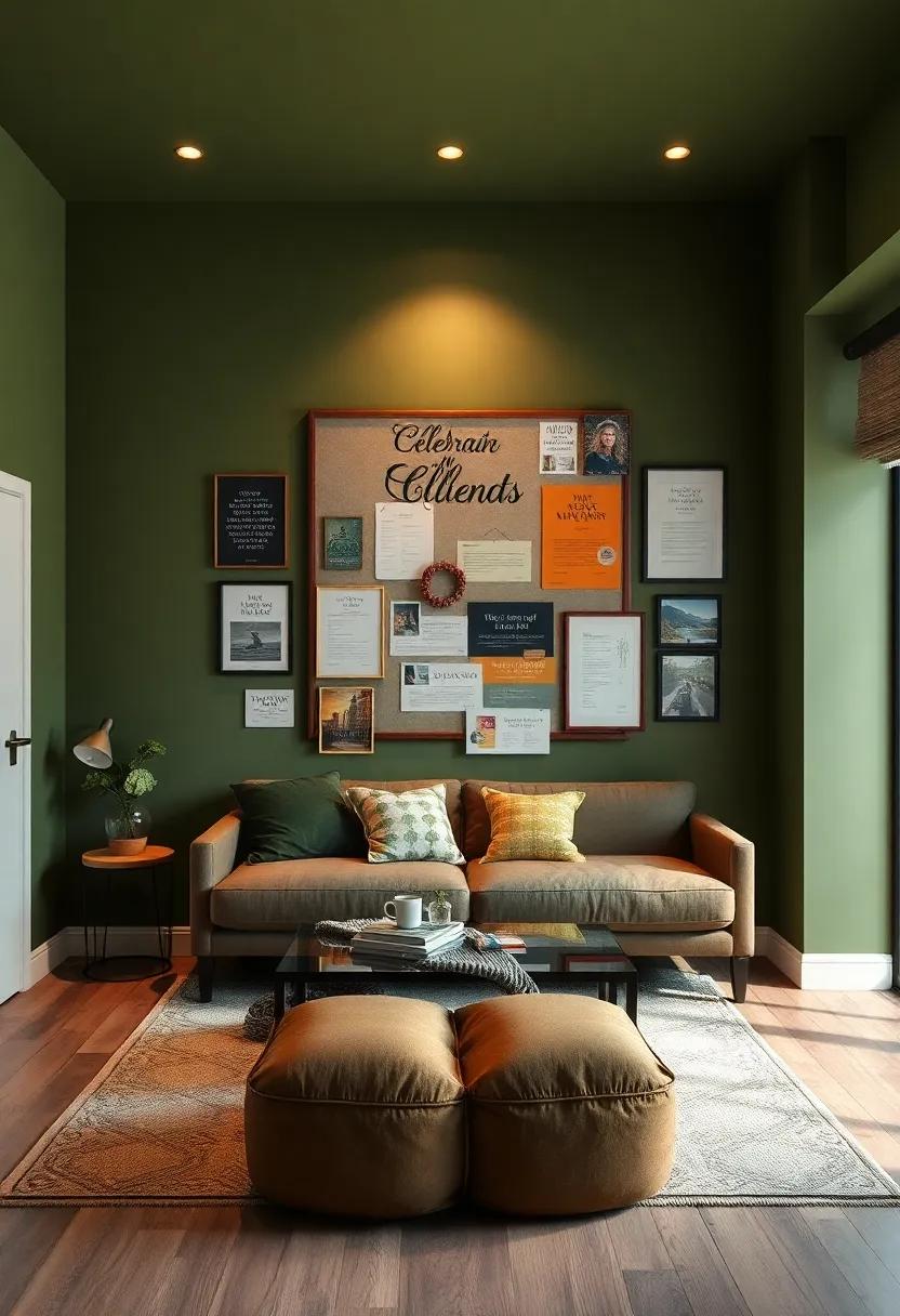 incorporate a variety of elements, such as photo collages showcasing memorable moments and achievements alongside renowned quotes from influential figures. Consider arranging them in an appealing layout that allows for easy updating; you might explore using mini clips or decorative washi tape for flexibility. To further enhance this space, add inspiring words or phrases on the olive green background using stencils or wall decals in contrasting colors like white or gold. This way, the wall not only becomes a reminder of past accomplishments but also a source of daily inspiration.