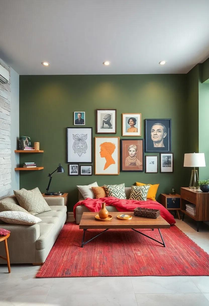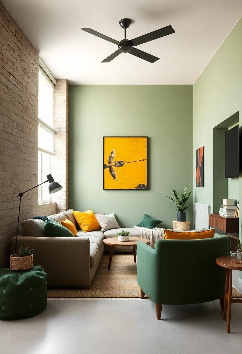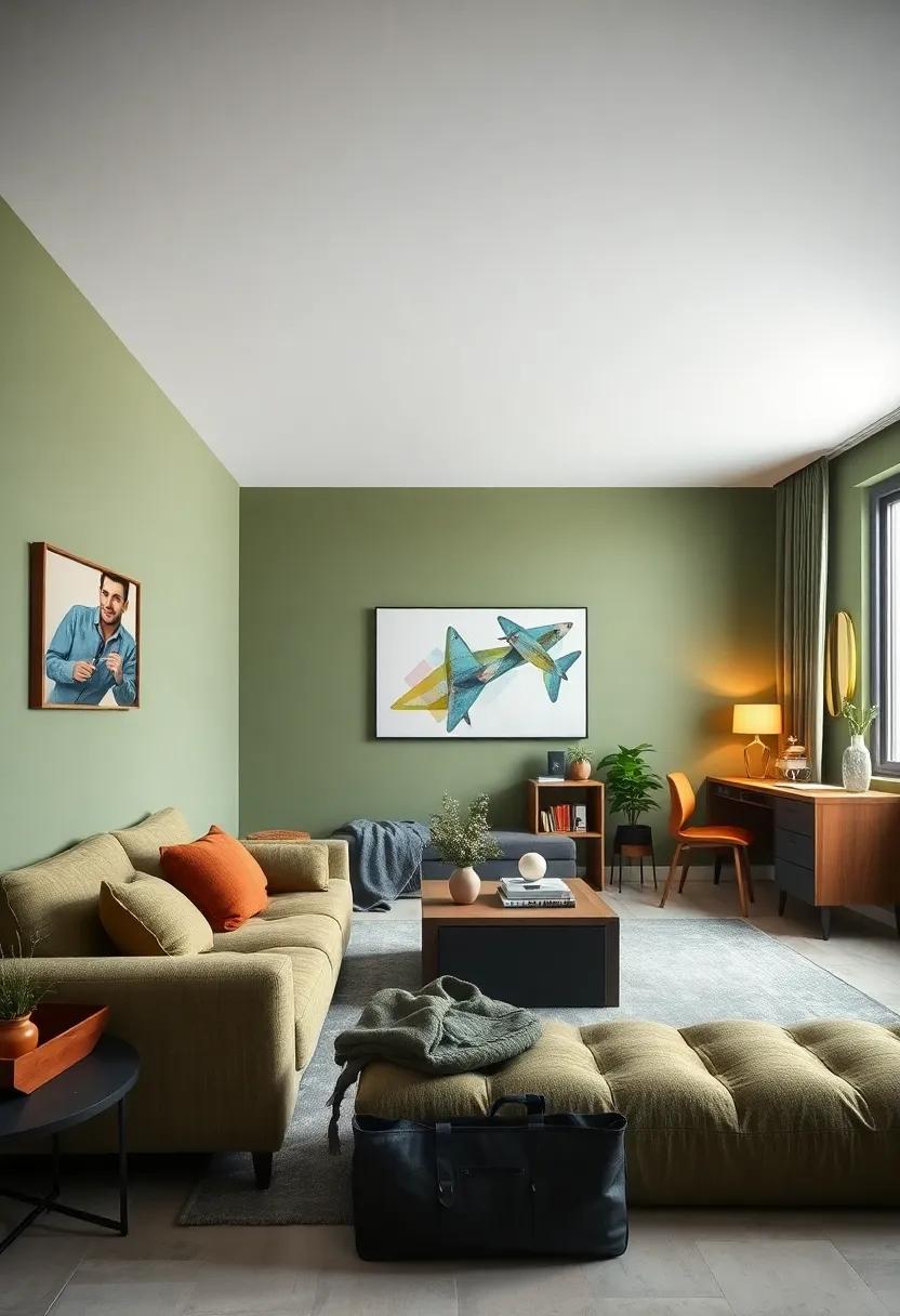 Introduce Color Pops: Integrate accent colors like mustard yellow or deep navy in accessories like cushions or art to uplift the olive green palette