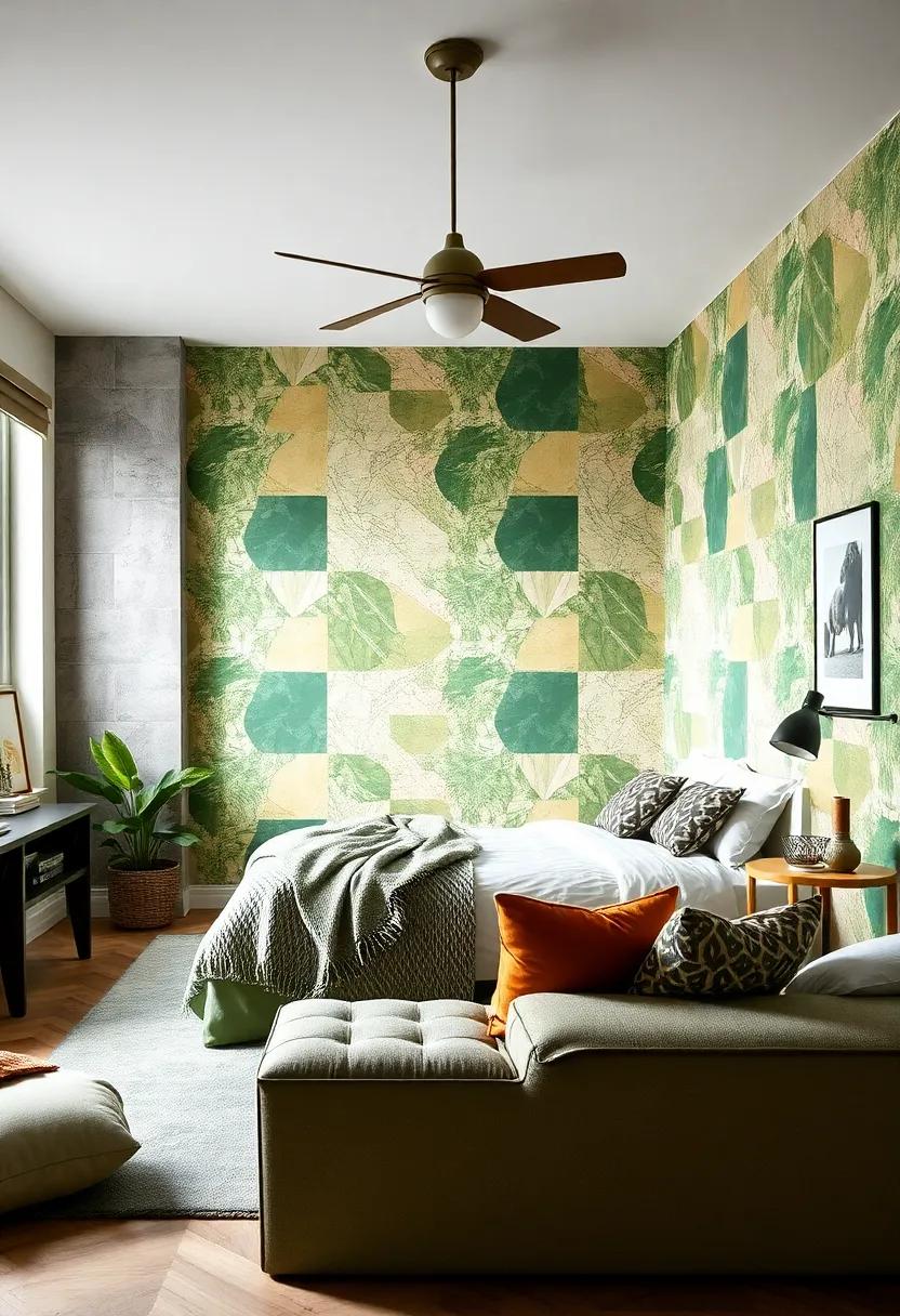 Transforming a room with a statement wall can create a focal point that enlivens the entire space. Removable wallpaper featuring geometric patterns in complementary colors to olive green can add depth and sophistication. Opt for designs that blend modern shapes with fresh hues, such as navy blue, mustard yellow, or soft gray. These colors not only enhance the olive undertones but also inject a sense of creativity and energy that resonates with a teenager’s dynamic personality.