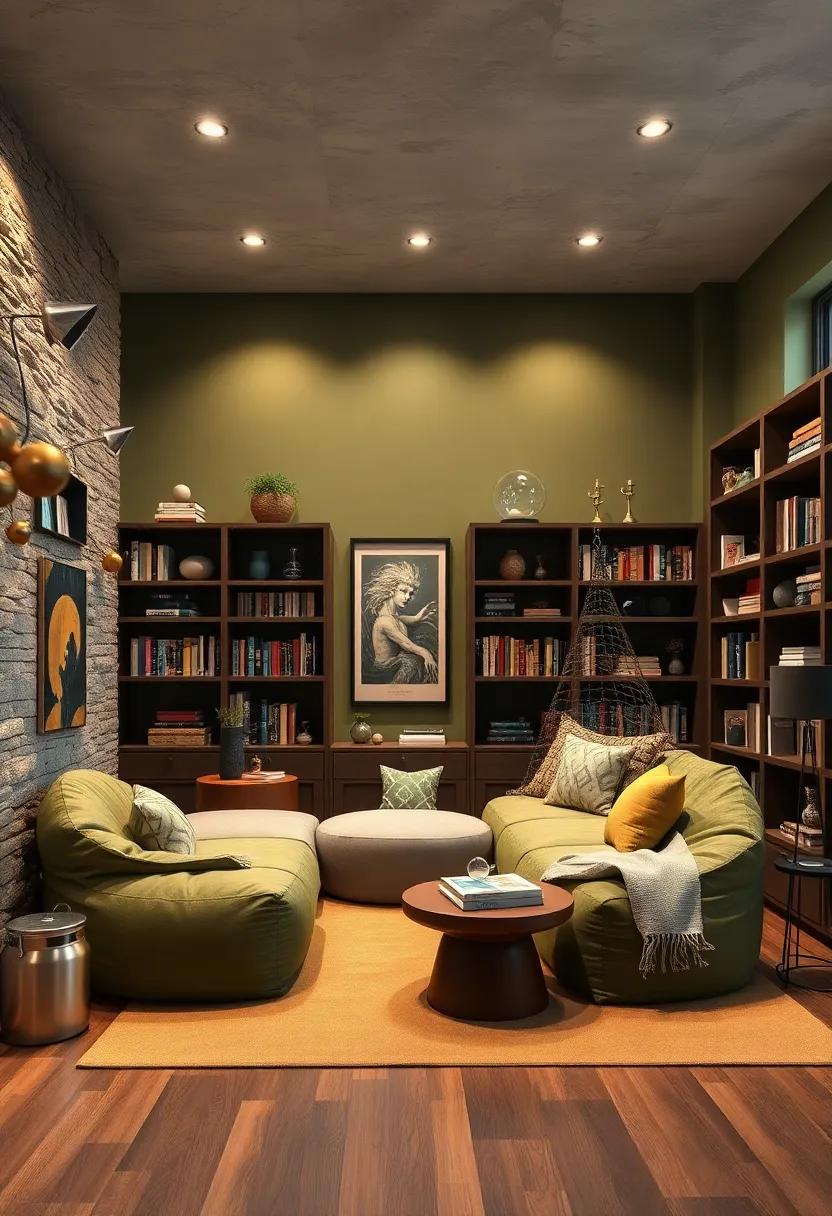 Transform that unused corner of the room into a cozy reading sanctuary.Start by choosing an oversized beanbag or a hanging chair in a shade that complements the olive green theme.Imagine sinking into a plush seat, the world around you fading away as you delve into your favorite stories. Surround your chosen seat with bookshelves that showcase not just books, but also personal treasures. Opt for unique designs that enable easy access to your collection while adding character to the space.