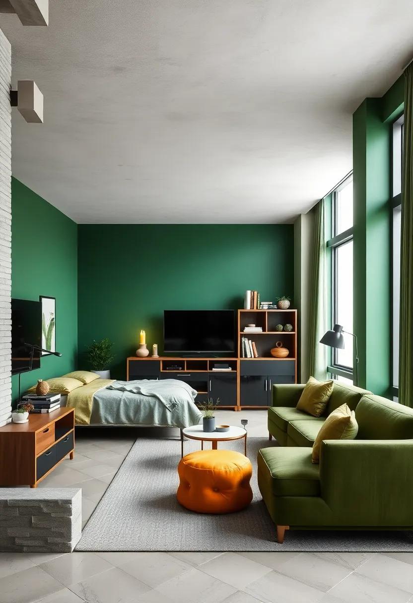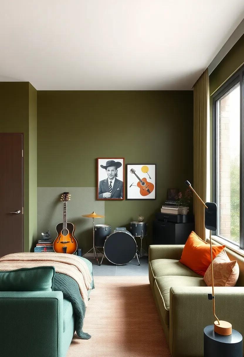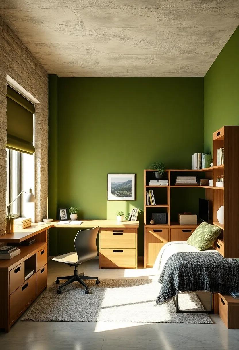 In choosing these elements, it’s essential to stick with a consistent color palette that complements olive green, such as whites, grays, or natural wood tones. This approach not only enhances the room’s visual appeal but also helps to cultivate a tranquil environment conducive to study and creativity.