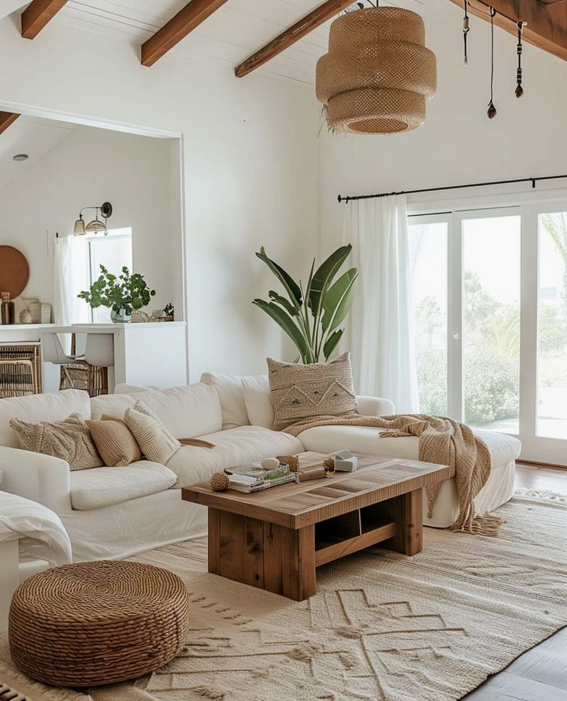 Here, the understated elegance of Scandinavian design harmonizes with the warmth of boho aesthetics. A crisp white sectional contrasts beautifully with a rustic wooden coffee table and a woven pouf, creating a serene, earthy environment. The open floor plan and abundant natural light evoke a coastal vibe, while layered rugs and organic materials soften the space, offering a tranquil retreat that whispers comfort rather than demands attention.