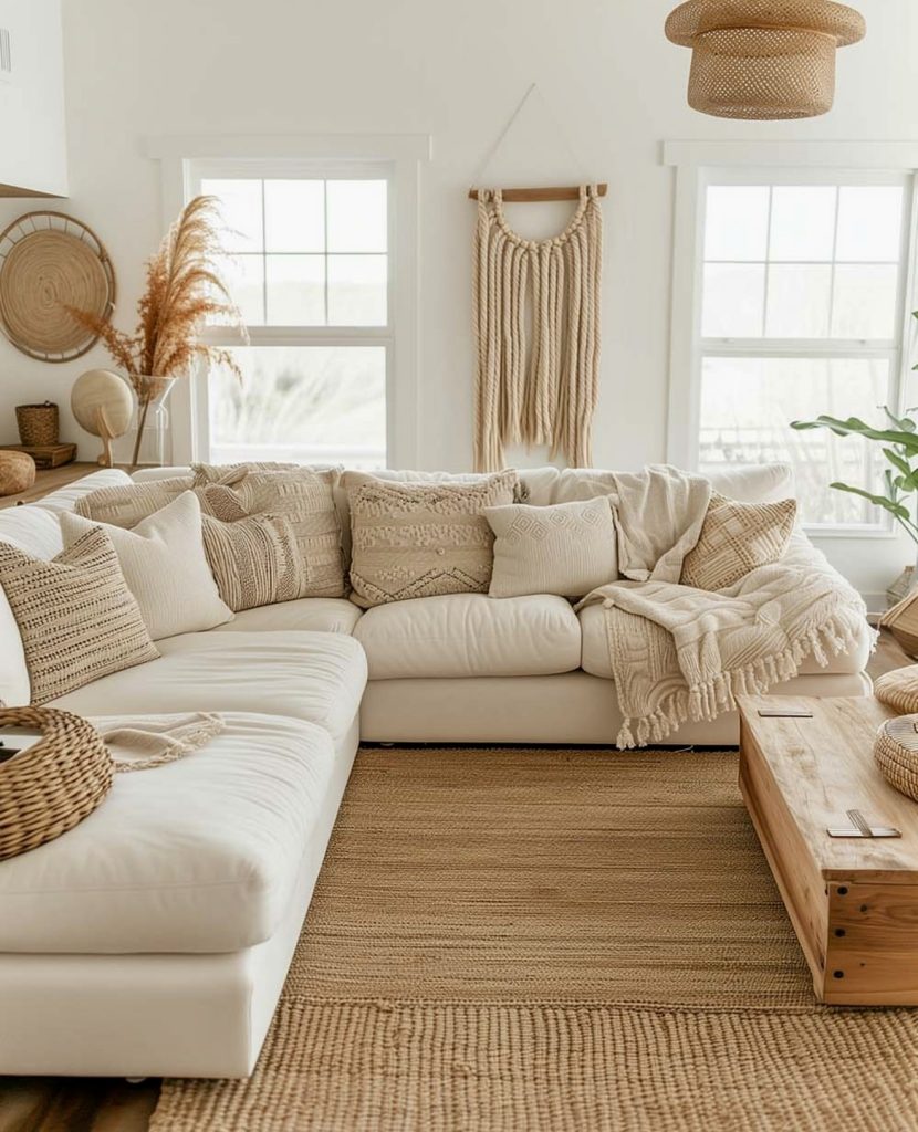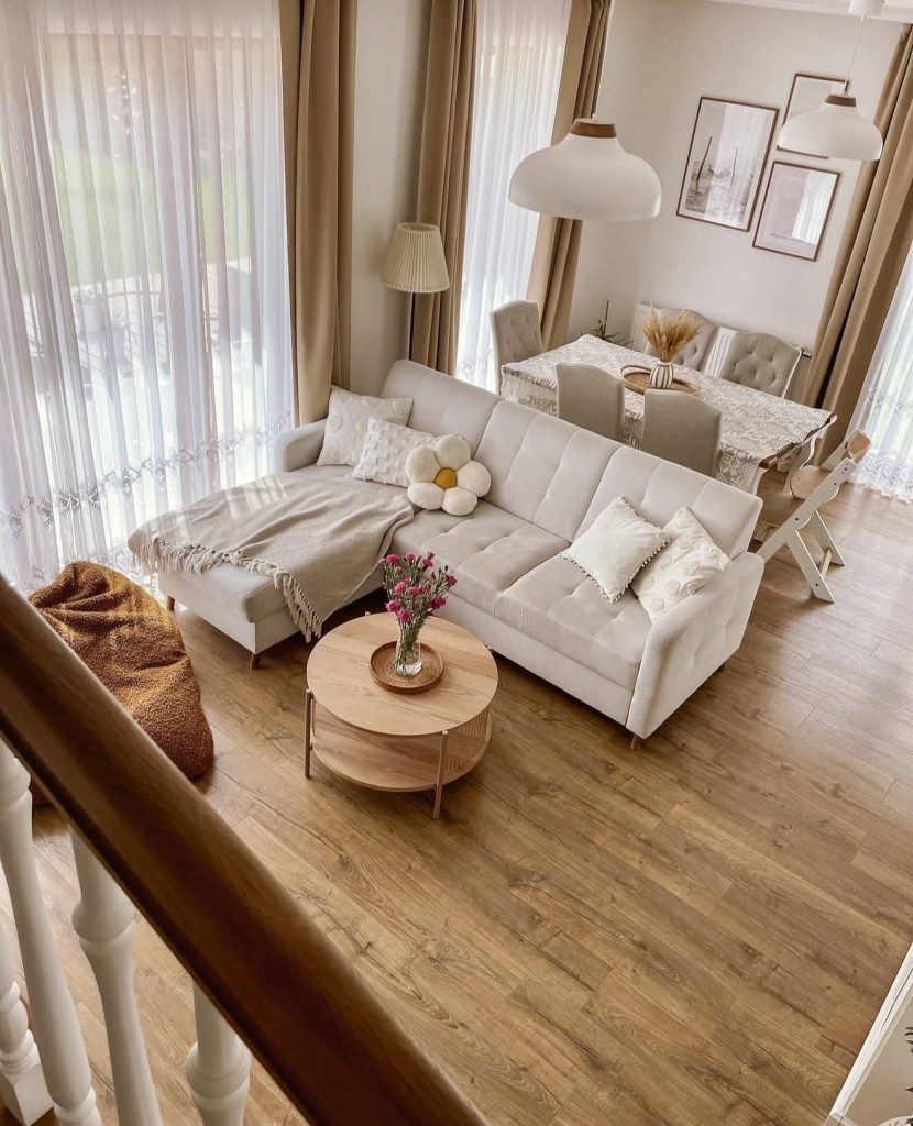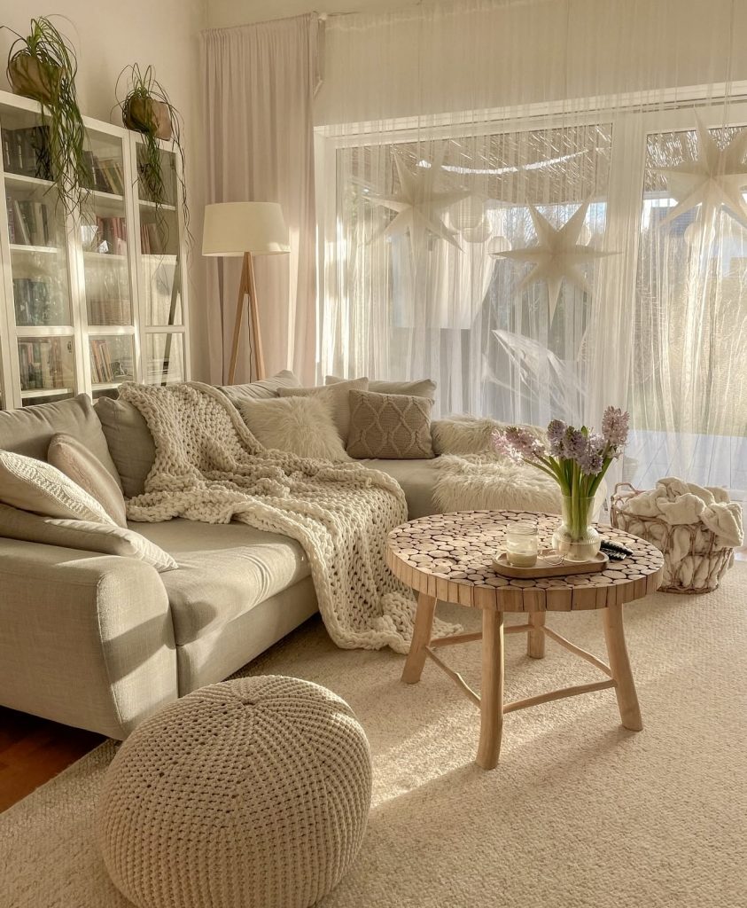Defined by soft textures and warm golden light, this inviting living room is perfect for relaxing mornings or evenings. Chunky knit throws, macramé accents, and natural wood tones create a snug atmosphere. Light filtering through sheer curtains adds a touch of Scandinavian calm, while farmhouse elements like a wooden table and neutral colors enhance the homely feel. It’s an inspiring example of modern design that truly feels like home.