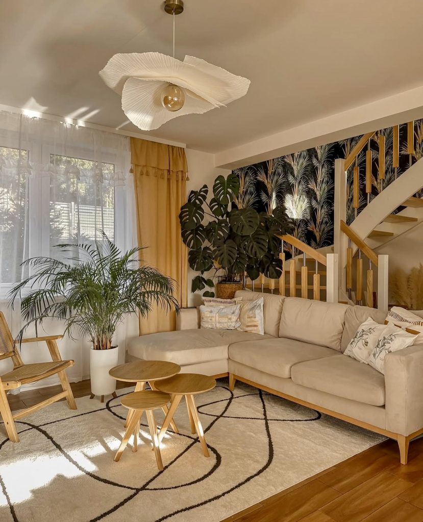For enthusiasts of minimalist interiors, this living room exemplifies how boho style can evolve into a refined, modern aesthetic. Neutral tones dominate, complemented by natural elements like cane furniture and sculptural lighting paired with leafy greenery. The overall design feels intentional and light, blending Scandinavian restraint with the warmth of organic materials. It’s a space that embodies mindful living—uncluttered, elegant, and serene.
