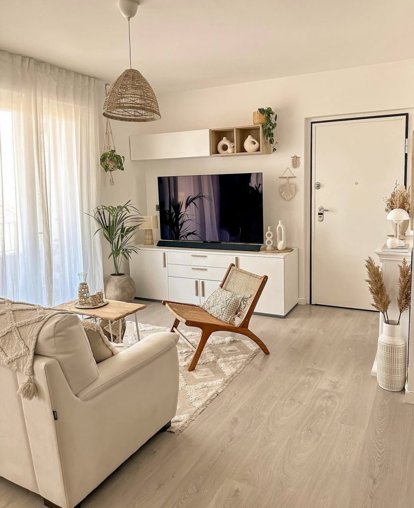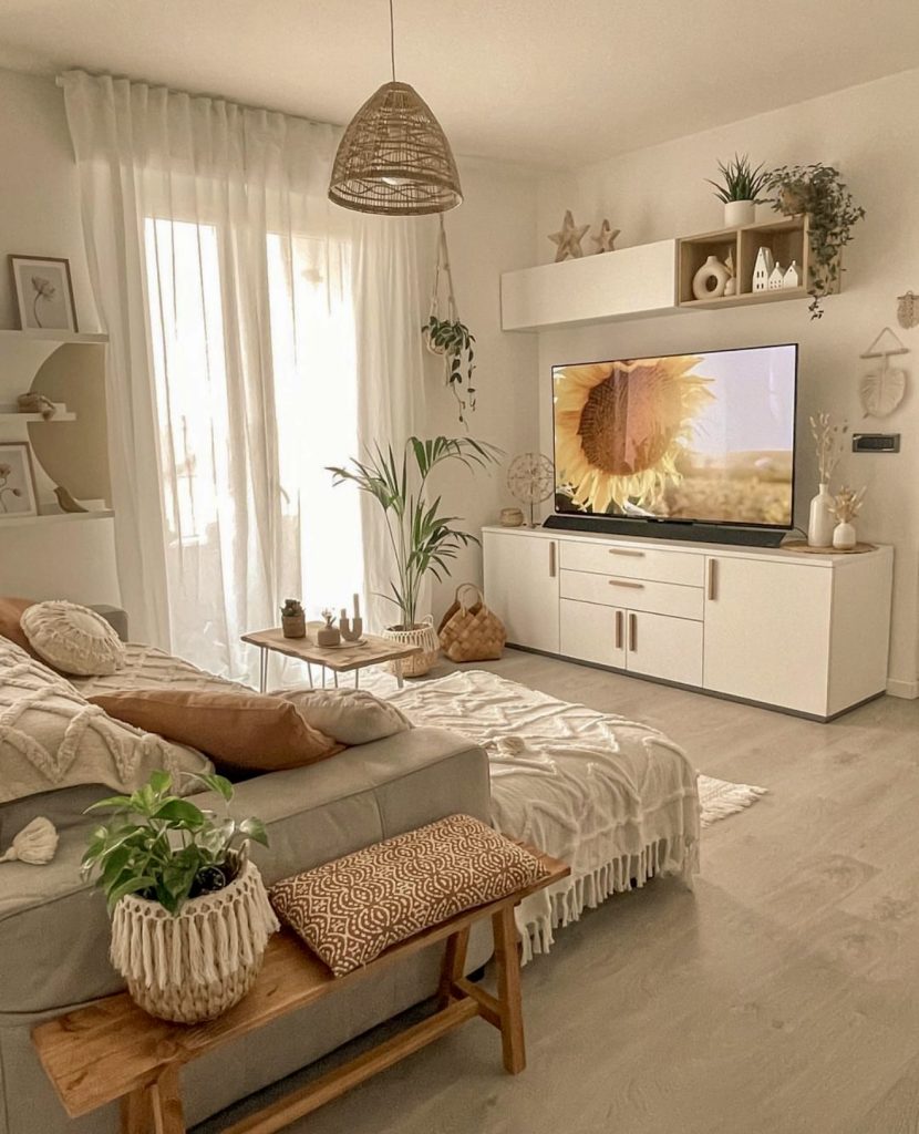 This modern boho living area feels like a gentle embrace—airy, light, and perfectly balanced. A neutral color scheme of beige and white fosters tranquility, while woven accents and hanging plants add organic charm. The minimalist TV wall features sleek cabinetry and soft textiles layered through throws and cushions. Natural touches such as starfish decor, palm leaves, and woven baskets introduce a subtle coastal influence, making this space a polished yet relaxed haven.