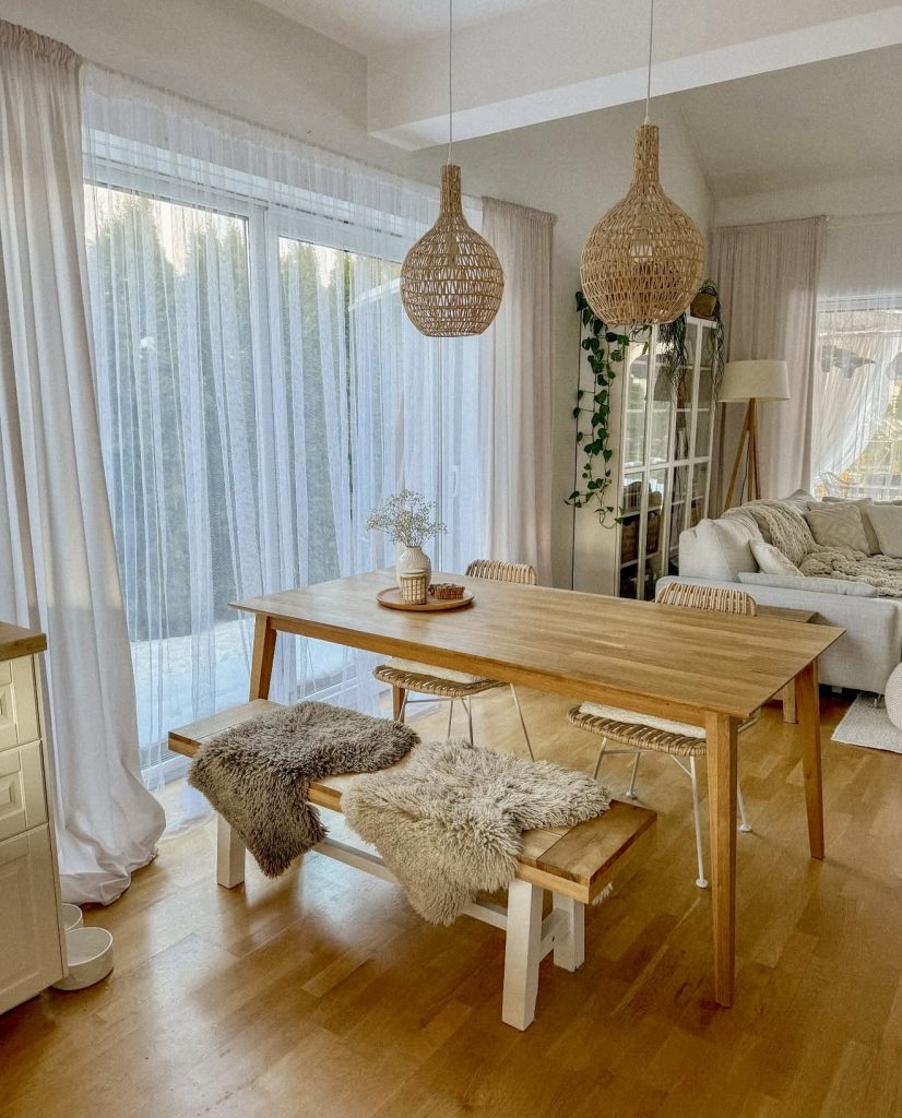 This dining area beautifully merges Scandinavian minimalism with bohemian warmth. A natural wood table paired with woven pendant lights creates an earthy balance, while soft sheepskin throws draped over benches invite leisurely mornings and heartfelt conversations. Sunlight filters through sheer curtains, enhancing the cozy atmosphere. Every element, from minimalist vases to organic textures, demonstrates that boho design can be both contemporary and effortlessly chic.