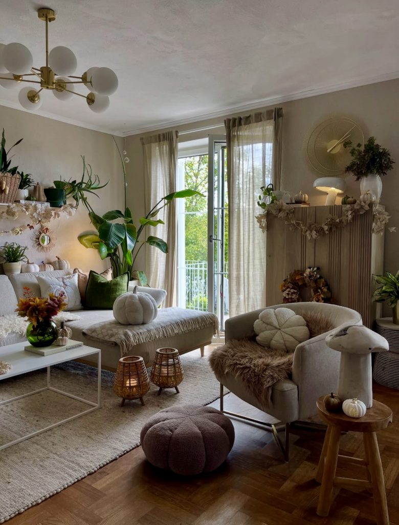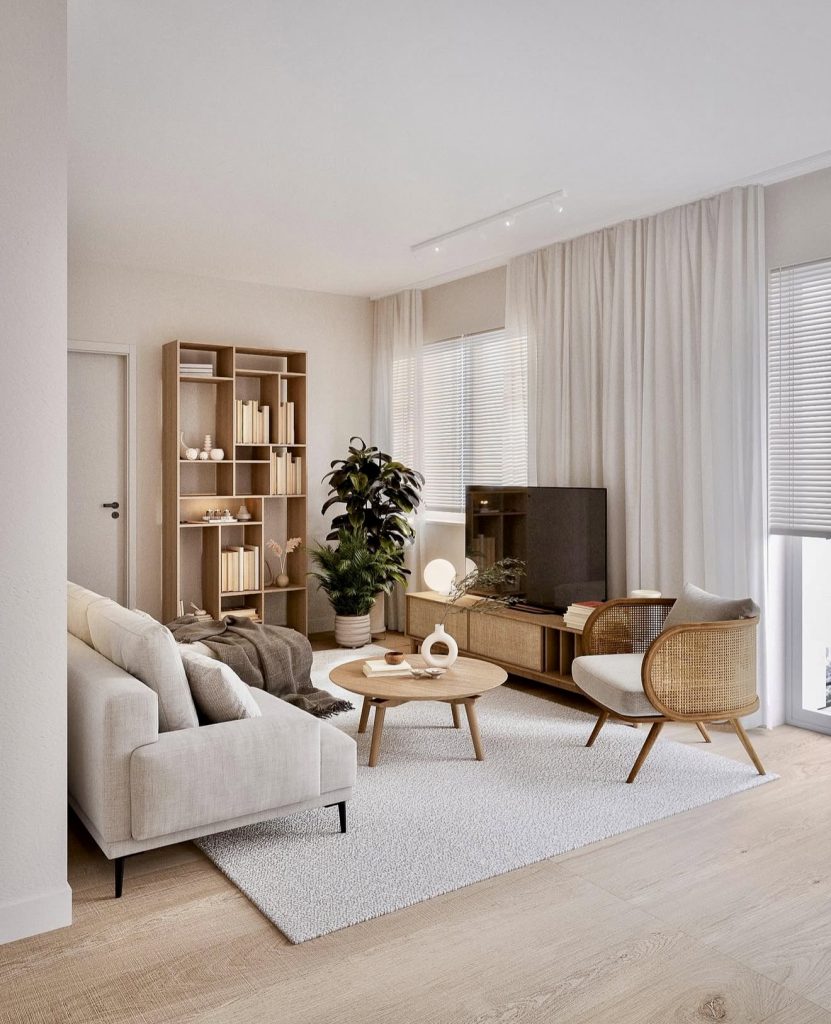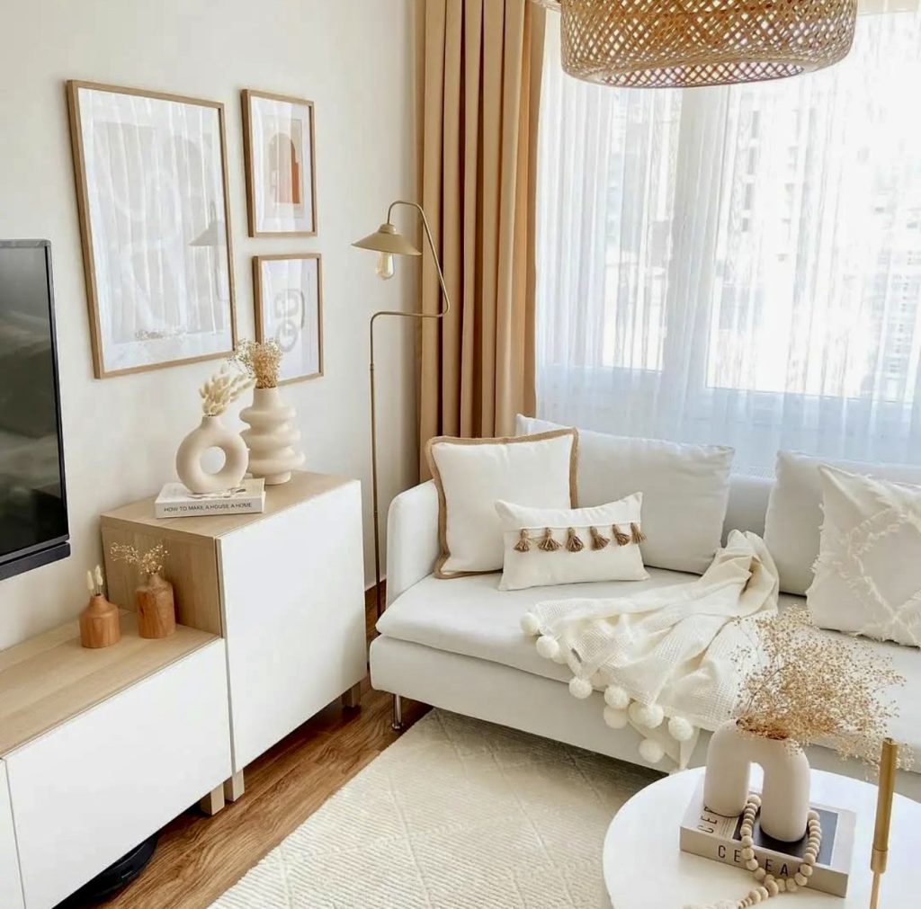 This space offers a gentle take on boho style, where minimalist sophistication meets inviting comfort. A soothing palette of cream, beige, and taupe brightens the room, complemented by sheer curtains and plush fabrics that create a welcoming atmosphere. The rounded coffee table adds warmth without overcrowding, reflecting Scandinavian influences in its simplicity. Carefully selected accents like floral motifs and textured throws make this an ideal sanctuary for peaceful mornings or quiet evenings.