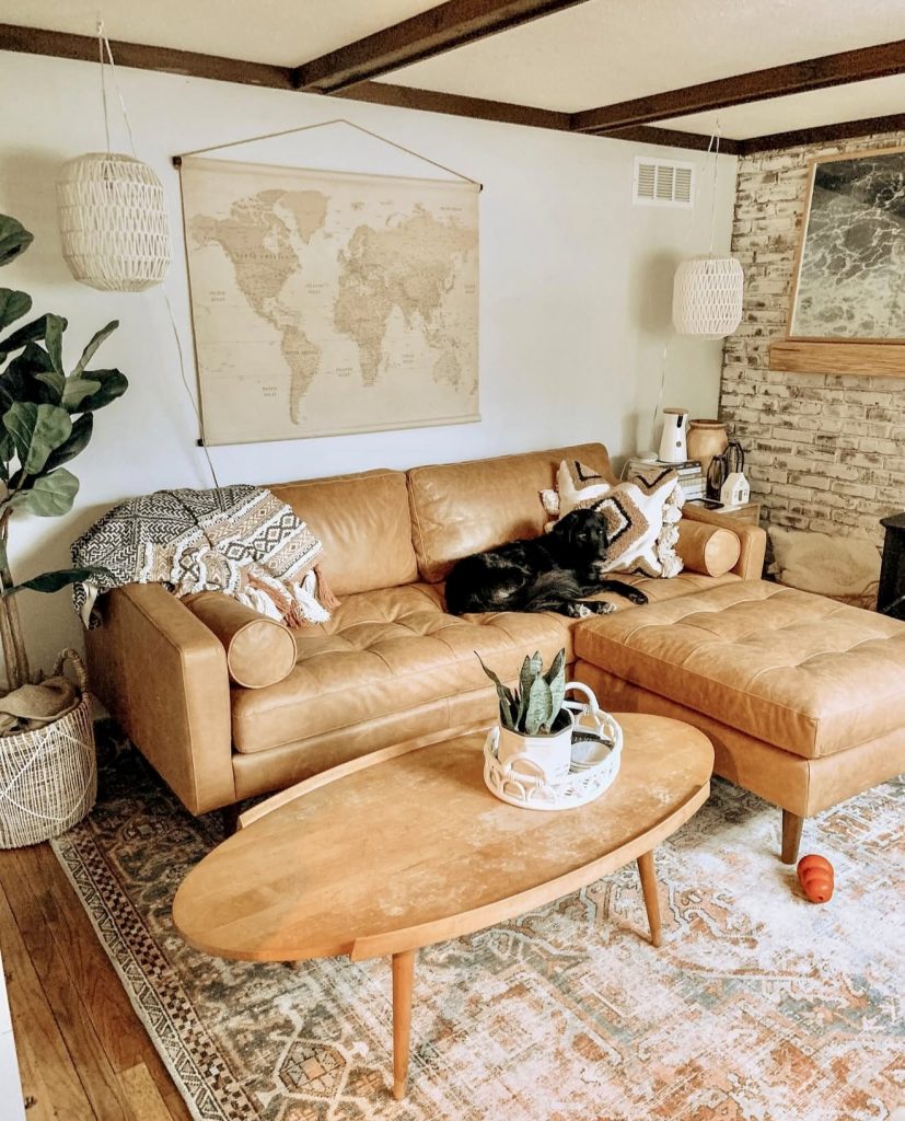 This design pays homage to the western origins of boho style, combining rugged charm with refined comfort. A mid-century leather sofa sets a warm tone, complemented by a vintage rug that adds texture and depth. Afro-inspired patterns on throws and cushions introduce a worldly flair, while natural wood and stone accents ground the palette. The cozy dark undertones and wanderlust-inspired world map art create a welcoming space for adventurous souls.