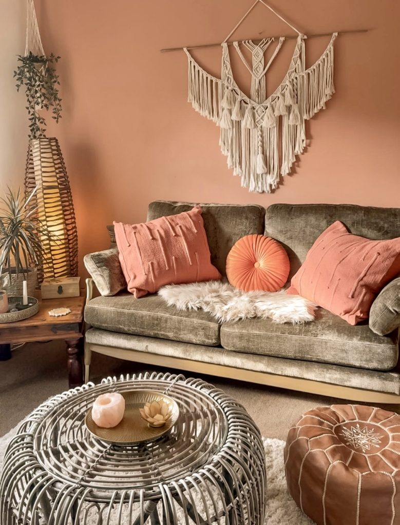 This lively living room combines colorful design with Afro artistry, radiating personality and warmth. A rich pink backdrop sets a cozy yet playful mood, enhanced by textured macramé wall hangings, a Moroccan pouf, and rustic wooden accents. This space exemplifies how boho decor celebrates uniqueness—a vibrant environment that encourages creativity, conversation, and soulful imperfection.