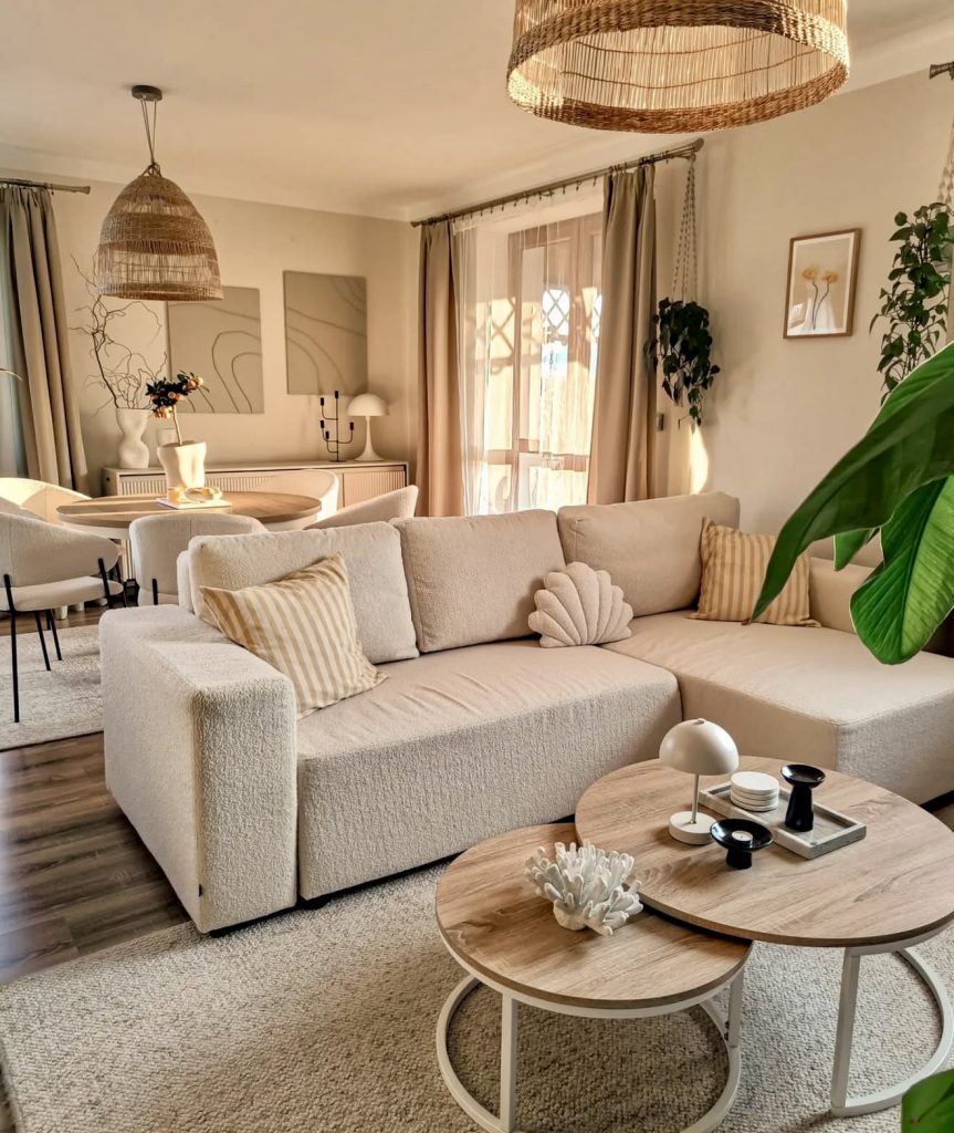 This living room exudes refined boho elegance through soft neutrals and layered natural textures. Curved furniture shapes, warm woven pendant lighting, and subtle Scandinavian influences create a tranquil atmosphere. A combination of round coffee tables and a plush sectional fosters a cozy yet sophisticated setting. Accents like coral decor, striped cushions, and greenery introduce a gentle coastal vibe, making this space a timeless inspiration for peaceful living.