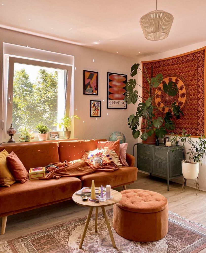Vibrant and full of personality, this retro-inspired boho space features a burnt orange velvet sofa that adds warmth and depth. Bold wall art and patterned tapestries layer vintage richness, while greenery and Afro-inspired decor bring a global touch. This room is a celebration of expressive style, demonstrating that boho design continues to honor individuality and joyful imperfection.