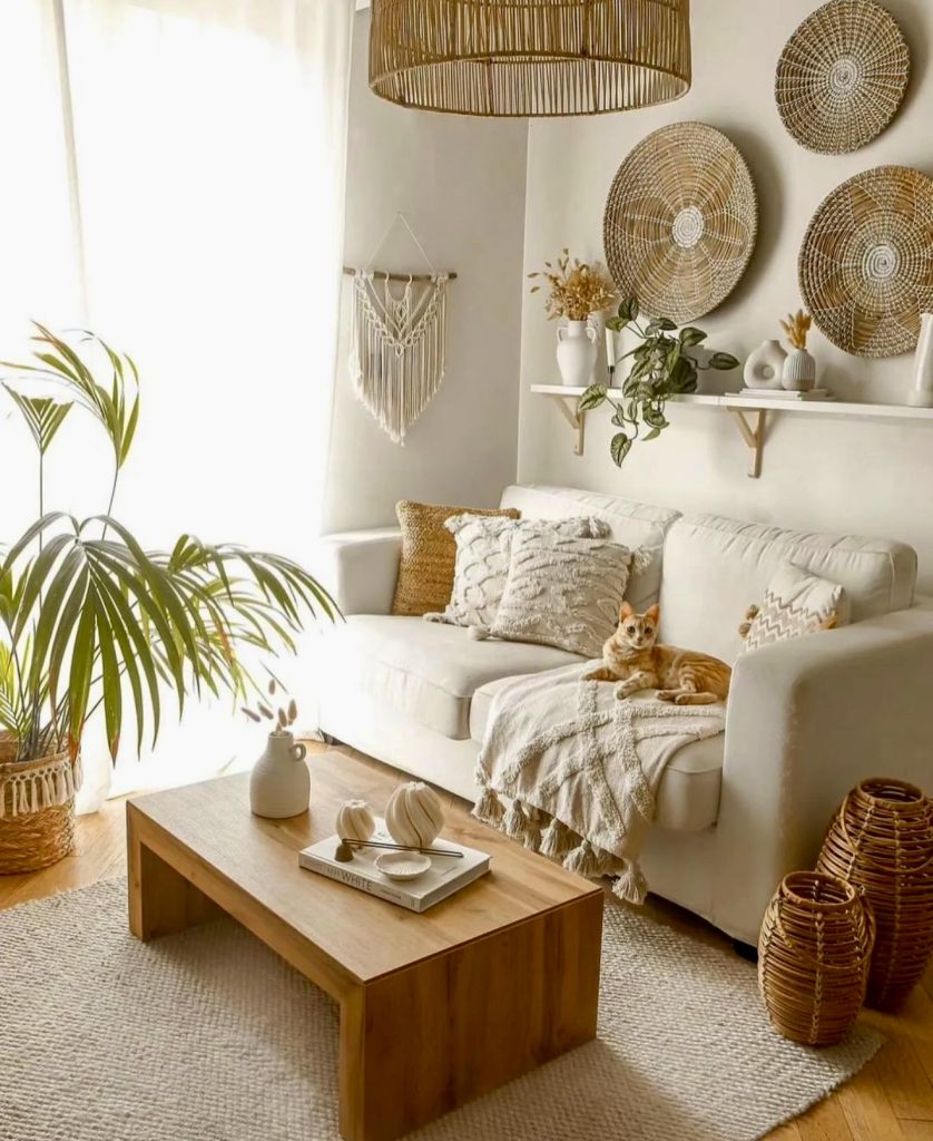 Basket walls are a signature element of bohemian interiors, showcased here as a stunning textural feature. The beige and cream color scheme evokes soft sunlight, while earthy tones create an open, airy feel. Woven poufs, jute rugs, and wooden furniture harmonize beautifully, with houseplants adding a natural touch. This is layered minimalism at its best—modern, cozy, and soothing, perfect for minimalists who value substance and style.