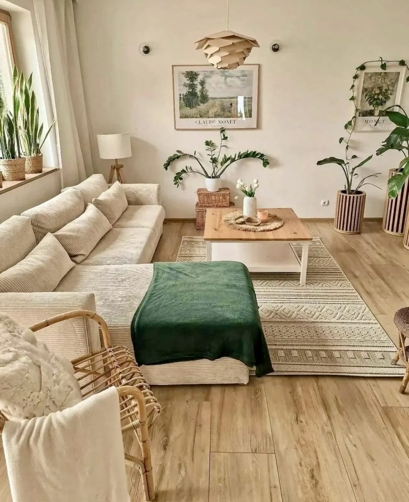 Green tones take center stage here, breathing vitality into the boho living space. Muted sofa and wall colors are enlivened by vibrant plants and warm wooden floors. Layered rugs, textured cushions, and rattan accents subtly reference Afro and Scandinavian styles, creating a globally inspired yet grounded environment. This soothing modern interpretation effortlessly blends nature, comfort, and thoughtful design.