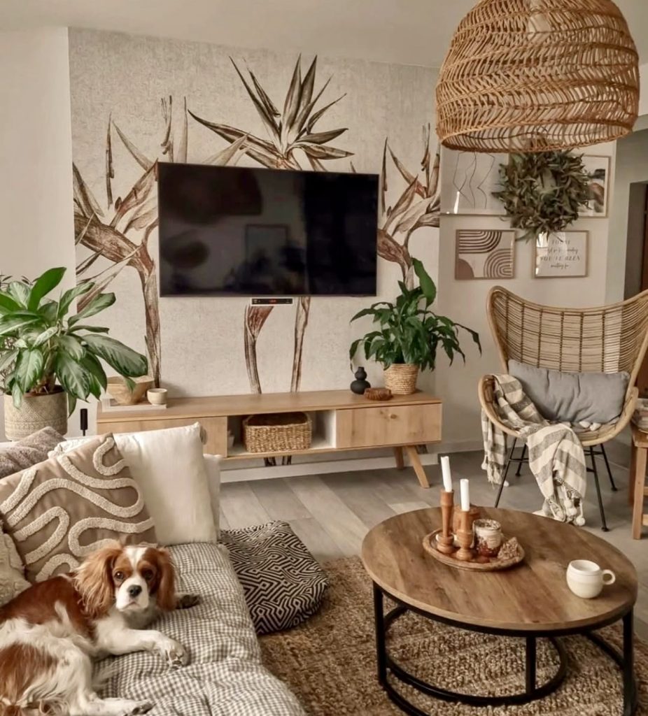 A captivating TV wall serves as the artistic centerpiece, framed by tropical patterns that blend Afro and coastal influences. Soft textures, leafy plants, and sleek furniture pieces create a harmonious balance of comfort and style. The decor is layered yet purposeful, elevating the boho aesthetic into a refined, nature-inspired retreat grounded in soulful design.