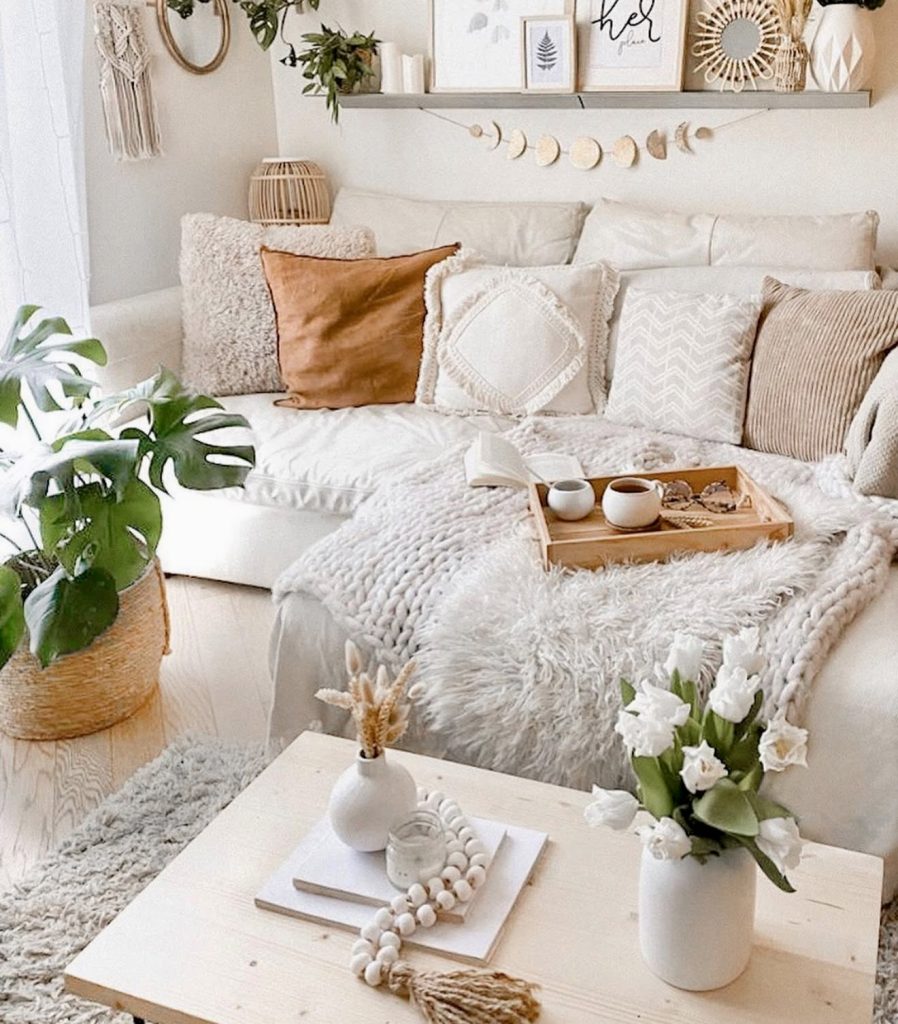 This farmhouse-inspired living room blends boho softness with timeless simplicity. Thick knitted throws, fur accents, and earthy hues add depth to a calm neutral base. Macramé and rattan details introduce texture, while greenery keeps the space fresh and organic. It’s a gentle reminder that boho decor doesn’t need to be loud—sometimes, tranquility and texture speak volumes. The result is effortlessly cozy and heartwarming.