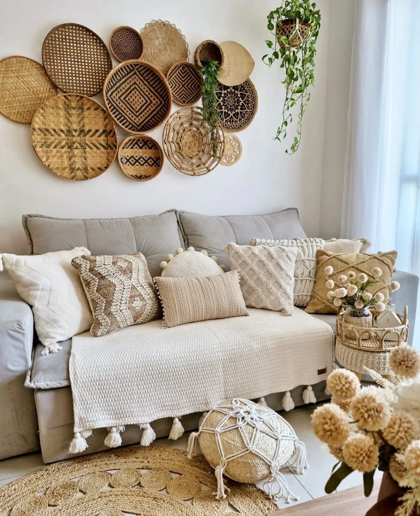 This peaceful nook embodies boho comfort through a blend of texture, tone, and natural elements. Basket walls provide depth and artisanal craftsmanship, while warm wood, woven details, and layered pillows create an inviting atmosphere. Sunlight plays across soft fabrics and lush greenery, making the space both earthy and tranquil. It’s an inspiring example for anyone seeking calm through simplicity.