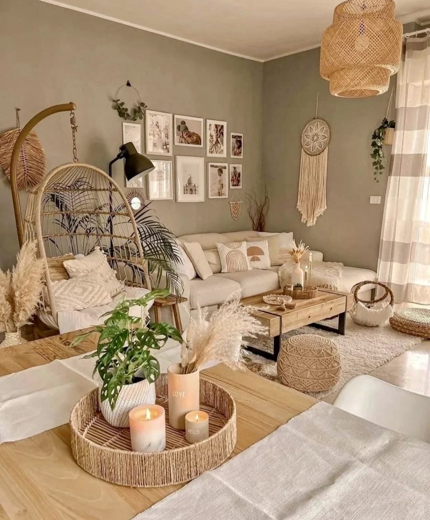 This living room perfectly captures the essence of bohemian comfort, where natural light enhances a palette of soft, earthy tones. The space features woven textiles, a neutral-toned sofa adorned with patterned cushions, and a hanging rattan chair ideal for relaxation. Decorative basket walls and macramé art introduce tactile interest, while pampas grass and warm wooden accents bring the outdoors inside. A muted green wall adds a calming, grounded atmosphere that complements both contemporary and rustic farmhouse interiors.