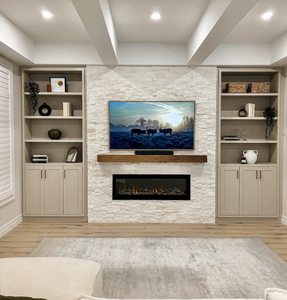 This design exemplifies the perfect union of technology and comfort by combining a television and electric fireplace within a single stone-faced built-in. The textured stone façade adds depth and contrast, while symmetrical shelving offers ample space for decorative and functional items. Beveled wood accents introduce natural warmth, balancing the sleekness of the flush-mounted TV. This streamlined approach enhances the room’s flow and visual appeal.
