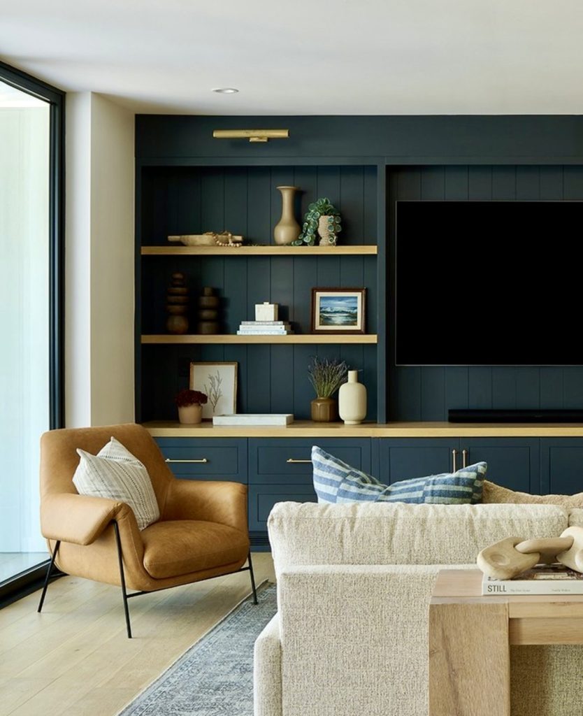 Rich navy built-ins instantly set a moody, sophisticated tone, especially when paired with natural wood accents. This combination elevates the shelves from mere storage to a curated art display. Lower cabinets keep clutter hidden, maintaining a clean aesthetic. The addition of tan leather furniture complements the warm atmosphere, striking a perfect balance between contemporary style and inviting comfort.