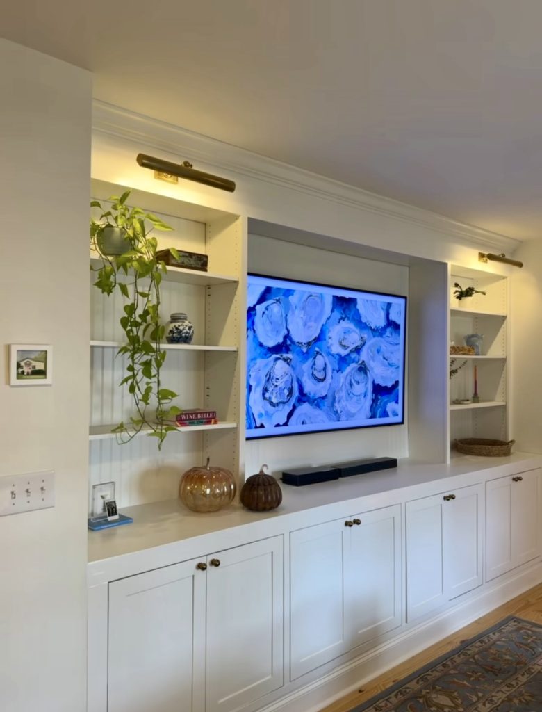 White built-ins bring a fresh, modern vibe to living rooms, especially when paired with brass gallery lighting that highlights displayed items. Surrounding the television with cabinetry and shelves creates a cohesive media wall. Proximity to windows allows natural light to complement the built-in lighting, brightening the space without overwhelming it.