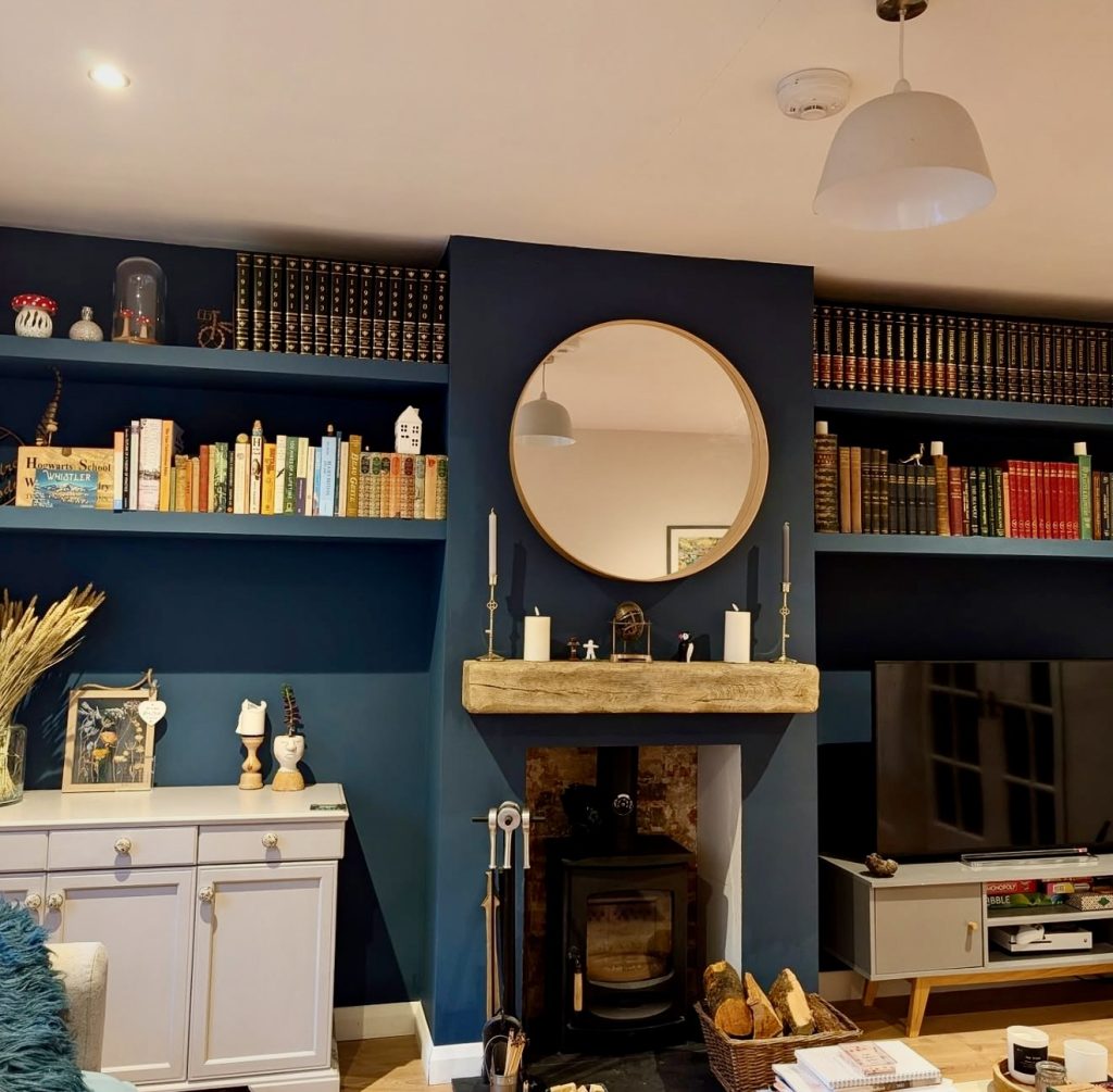 Combining rustic fireplace mantels with sleek, contemporary built-ins creates a cozy yet stylish living room. The navy shelving adds personality, while the weathered wood mantel ties the space together with warmth. Expanding built-ins around the room can enhance storage and visual continuity, especially in older homes where architectural features are prominent.