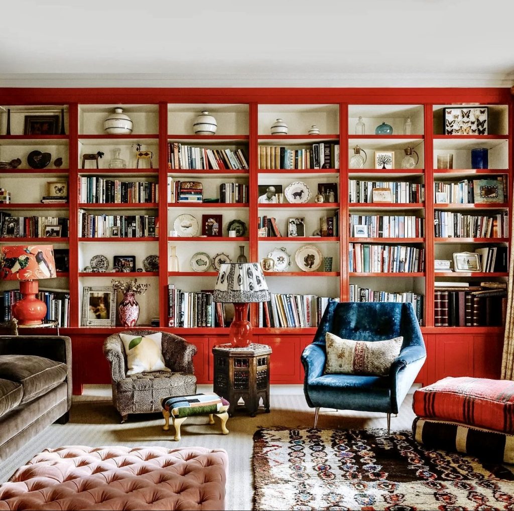 For those who favor a decorative over minimalist approach, built-ins painted in striking hues like deep red transform walls into immersive library spaces. Combining books, artwork, lamps, and antiques creates a layered, eclectic look. Ample shelving allows for seasonal styling changes, keeping the room dynamic and personalized.