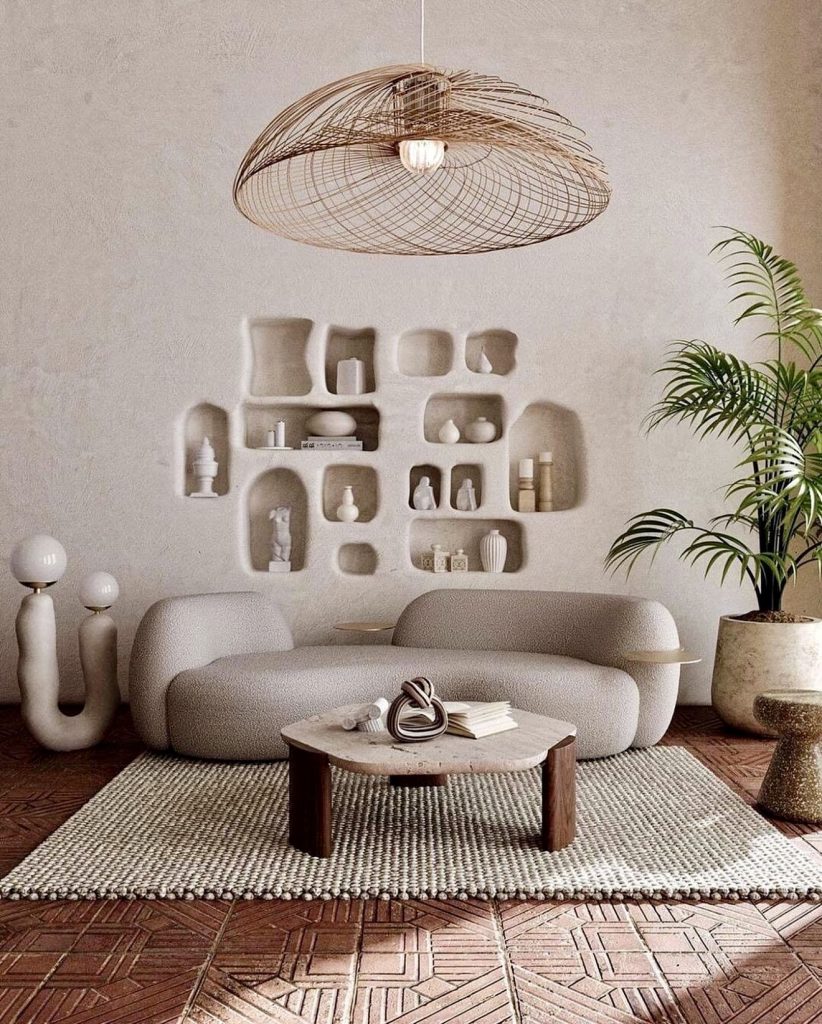 Carved shelving units with soft, rounded edges create sculptural focal points that double as storage. This approach suits homes with vaulted ceilings, offering a unique architectural element that complements monochromatic art and pottery. Such designs appeal to those who appreciate subtle artistry integrated into their living spaces.