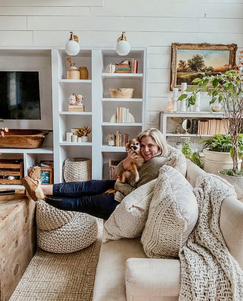 Wooden shelves paired with knitted textiles and natural greenery create a cozy, neutral backdrop that softens the presence of technology like televisions. This blend of textures fosters a welcoming atmosphere, perfect for family-oriented living spaces.