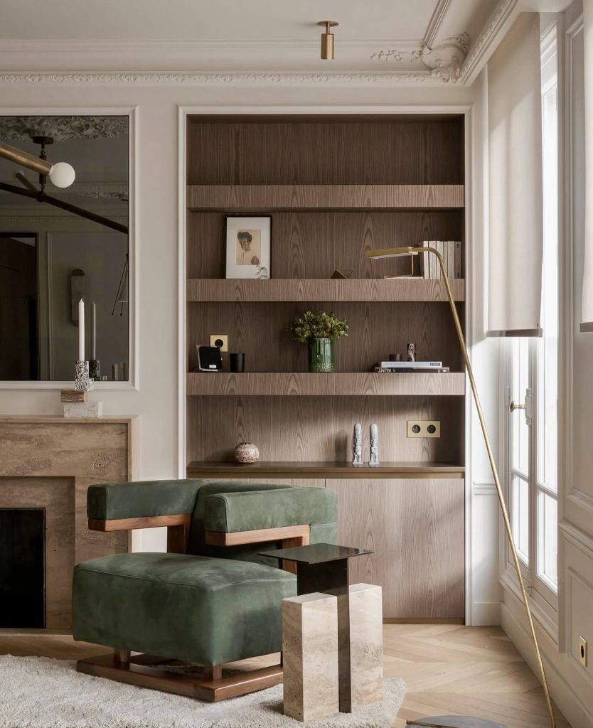 Recessed shelving units offer sculptural elegance through monochromatic simplicity. Ideal for lovers of understated beauty, these built-ins provide subtle display areas for small vases and decor, embodying the philosophy of ‘less is more’ with refined grace.