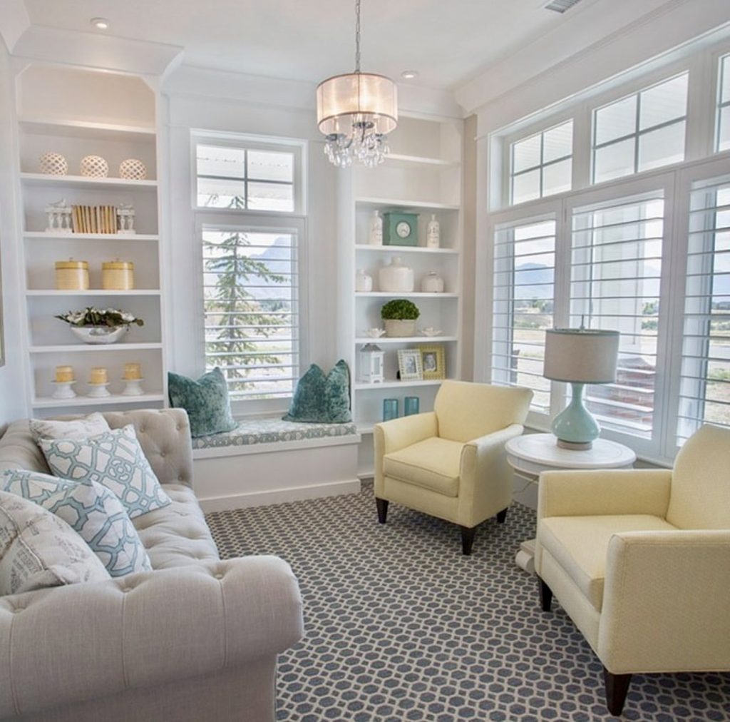 These white built-ins transform a bright window corner into a serene retreat. Soft pastel tones and delicate decor enhance the airy feel, making the space feel refreshing and personalized. This design adapts well to various ceiling heights, emphasizing natural light and openness.