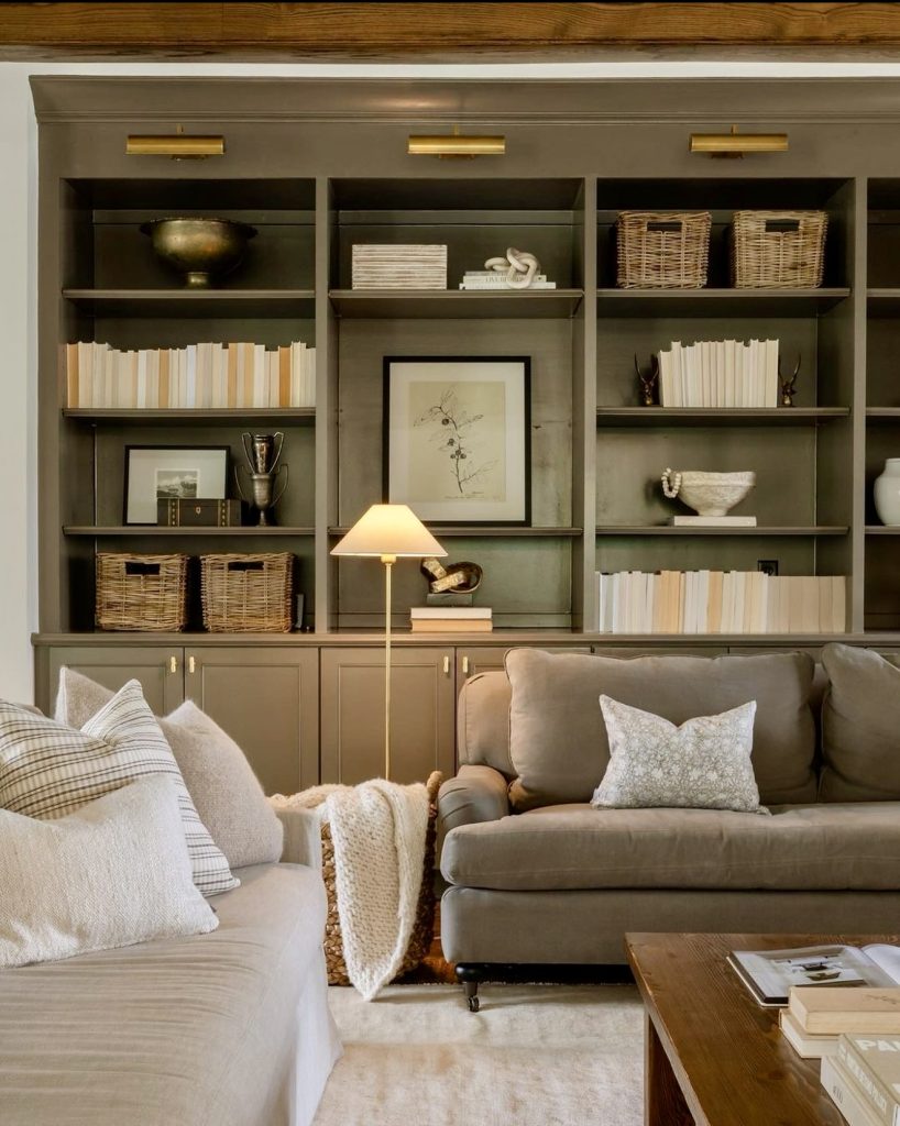 Deep-hued built-ins paired with brass picture lights create a sophisticated display wall. The combination of woven baskets, sculptural decor, and muted books adds texture and warmth. These cabinets offer both style and storage, perfect for those seeking a luxurious yet functional living space.