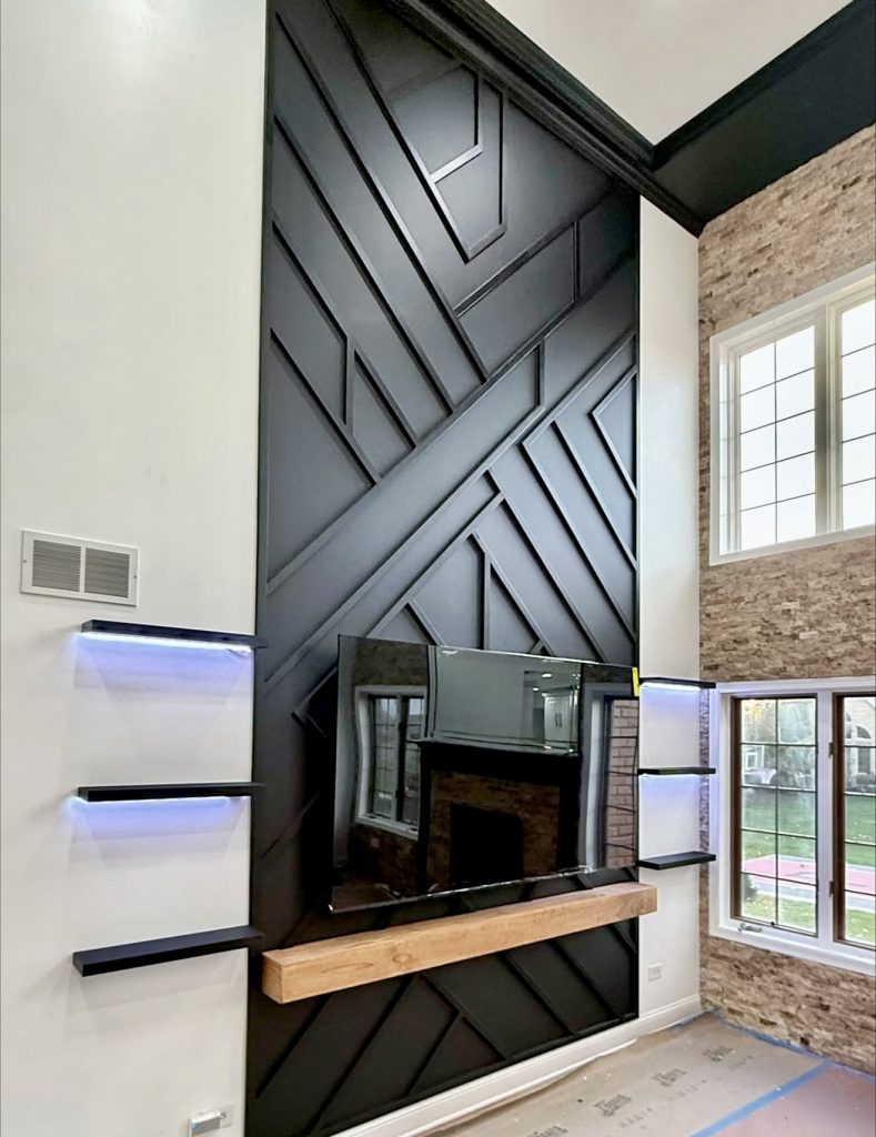 This bold design uses a dramatic black geometric wall to redefine built-in shelving. Slim floating shelves provide space for decor, while a wooden mantel introduces natural warmth. Ideal for homes with high ceilings, this setup integrates modern media needs with striking architectural flair.