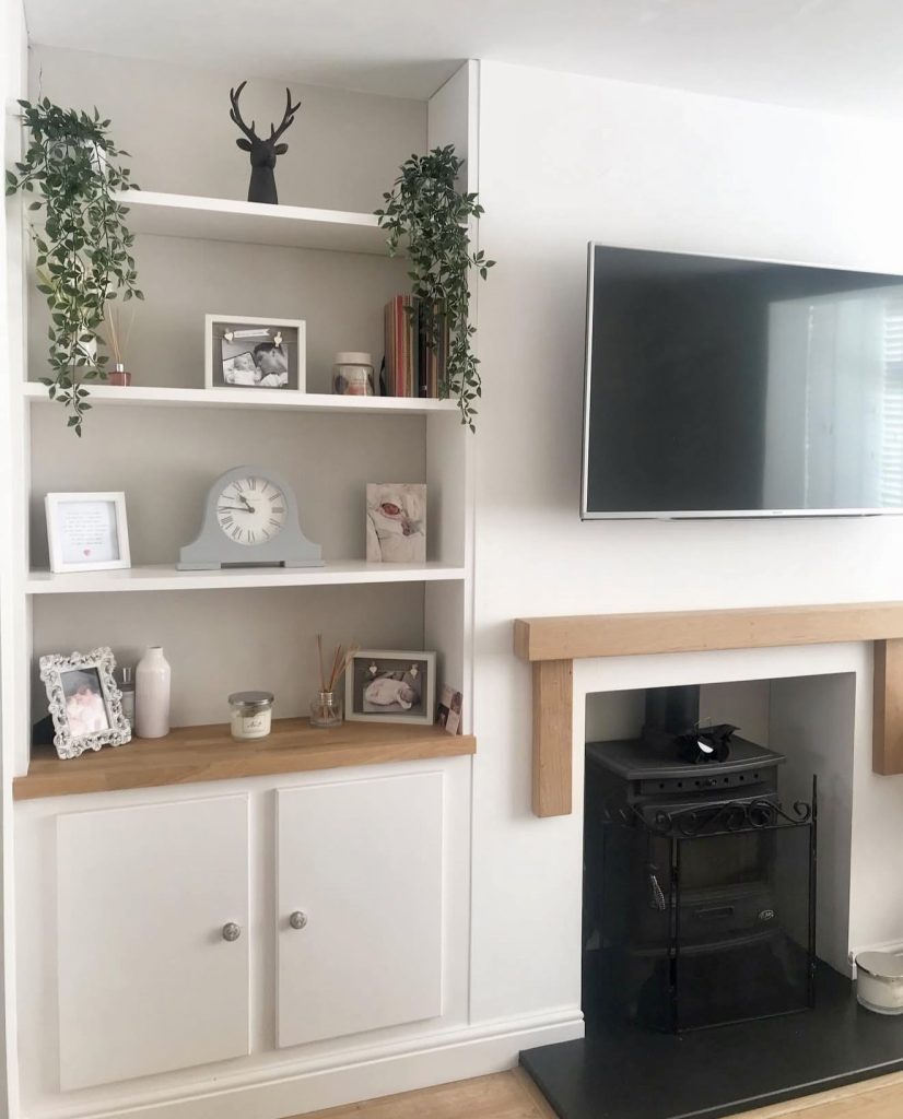 Neutral tones combined with wooden accents keep alcove shelving light and airy, making it a popular choice for compact living spaces like apartments. These minimalist shelves offer enough room for decorative styling without overwhelming the room, proving that subtlety can make a strong impact.