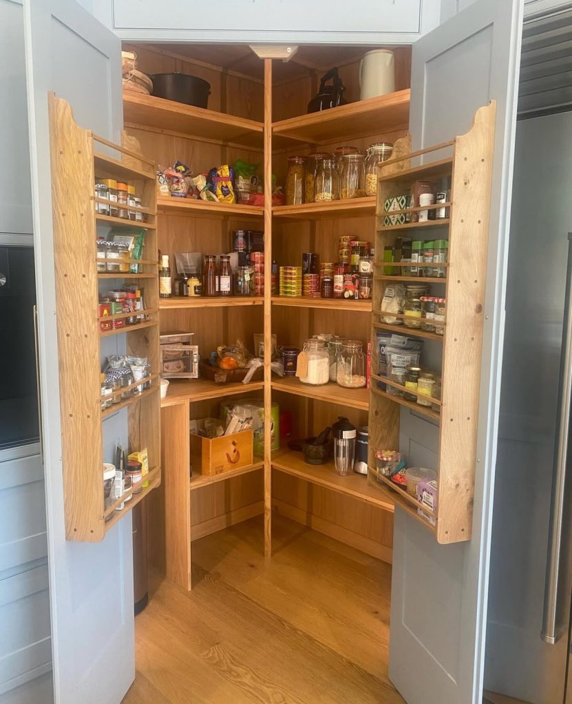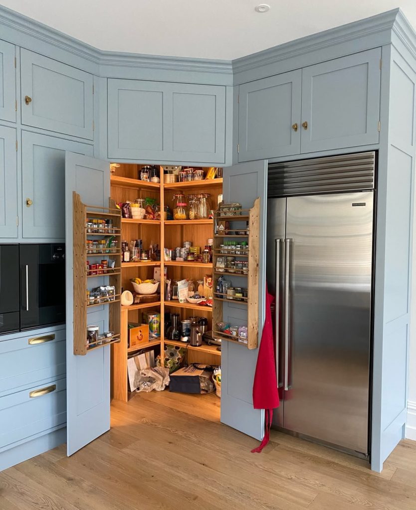 This bespoke corner pantry resembles a fine piece of furniture, featuring rich wood interiors and intricate shelving tailored for pantry enthusiasts. Every inch, including door racks for spices and oils, is thoughtfully utilized. The striking blue exterior makes a bold design statement, blending timeless elegance with practical storage solutions.
