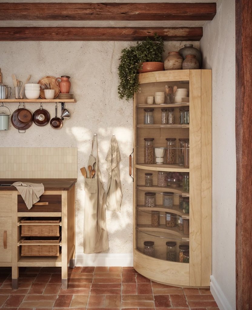 For enthusiasts of Mediterranean aesthetics, this corner pantry is a study in natural beauty and simplicity. Featuring a curved wooden cabinet with a glass door, it softens sharp architectural lines and adds visual flow. Complemented by earthy flooring and exposed wooden beams, the pantry offers straightforward shelving and organization, perfect for those who appreciate clean, functional, and elegant kitchen spaces.
