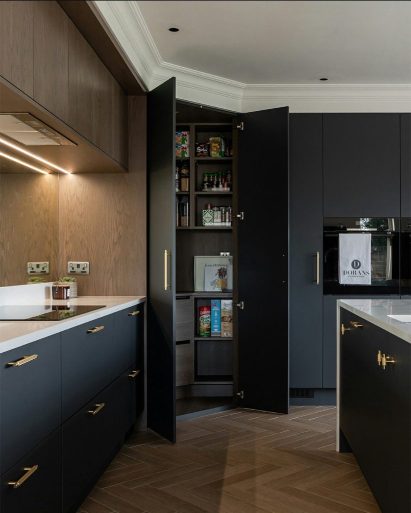 Featuring matte black cabinetry accented with gold hardware, this minimalist corner pantry exudes urban sophistication. Inside, walnut-toned shelves provide ample storage despite the compact footprint, making it perfect for small kitchens. This design offers a sleek solution for city dwellers who want to maintain an elegant kitchen aesthetic while maximizing storage.