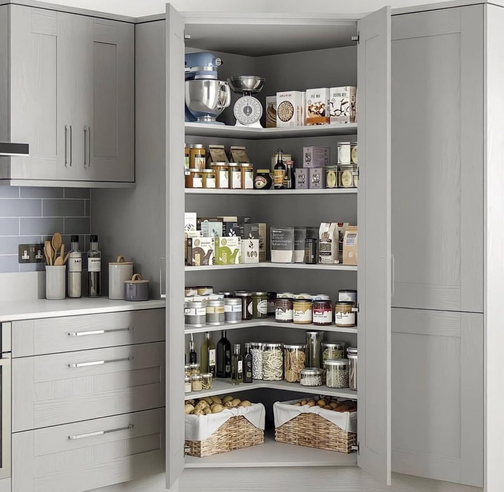 This tall corner pantry combines soft grey cabinetry with deep open shelves to create a highly organized space. Designed for visibility and accessibility, it accommodates everything from pasta jars to baking appliances and produce baskets. Its generous size and thoughtful layout make it an ideal upgrade for anyone seeking a stylish yet practical kitchen remodel.
