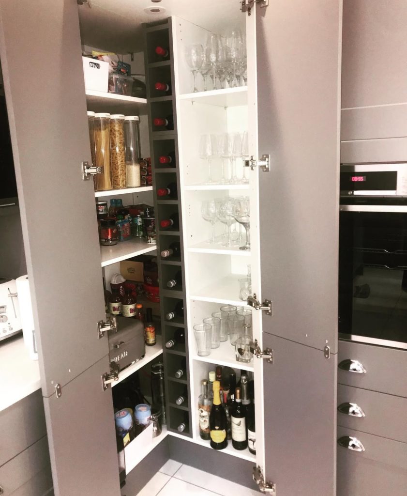 This smart corner pantry doubles as a wine cellar and dry goods storage, ideal for those who love to entertain. Full-height grey cabinets with integrated vertical wine racks, deep open shelves, and task lighting maximize vertical space without expanding the footprint. This design exemplifies how multi-purpose storage can be both stylish and space-efficient.