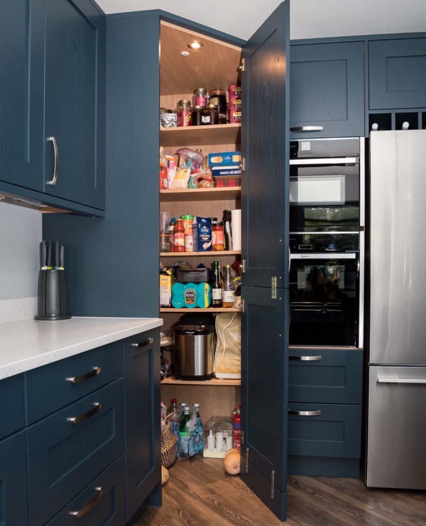 Bold navy cabinetry paired with built-in spotlights creates a striking and functional corner pantry. Vertical shelving is thoughtfully arranged for canned goods, beverages, and kitchen gadgets, making it ideal for busy households. Positioned next to the refrigerator, this pantry harmonizes with existing kitchen elements while maximizing storage efficiency.
