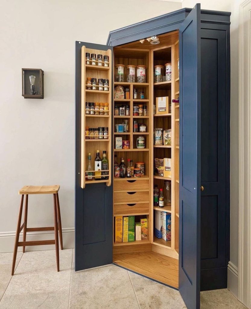 Rich blue cabinetry, carved crown molding, and textured stone flooring give this pantry a warm, heritage-inspired feel. The door doubles as a spice rack, while inside, a mix of drawers, shelves, and surface storage accommodates bulky supplies and baking essentials. This space combines character with functionality, perfect for those who want their kitchen storage to reflect their personality.