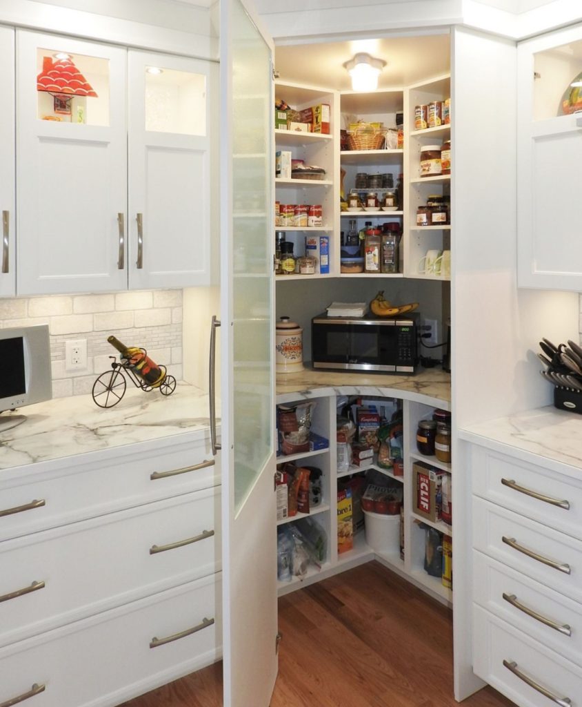 This innovative corner pantry combines storage with utility by incorporating a marble-look wraparound counter beneath illuminated shelving. The deep corner houses a microwave and other essential appliances, making it ideal for kitchens with limited space. Clever tiered shelving maximizes vertical storage, catering to busy cooks who need both organization and functionality.