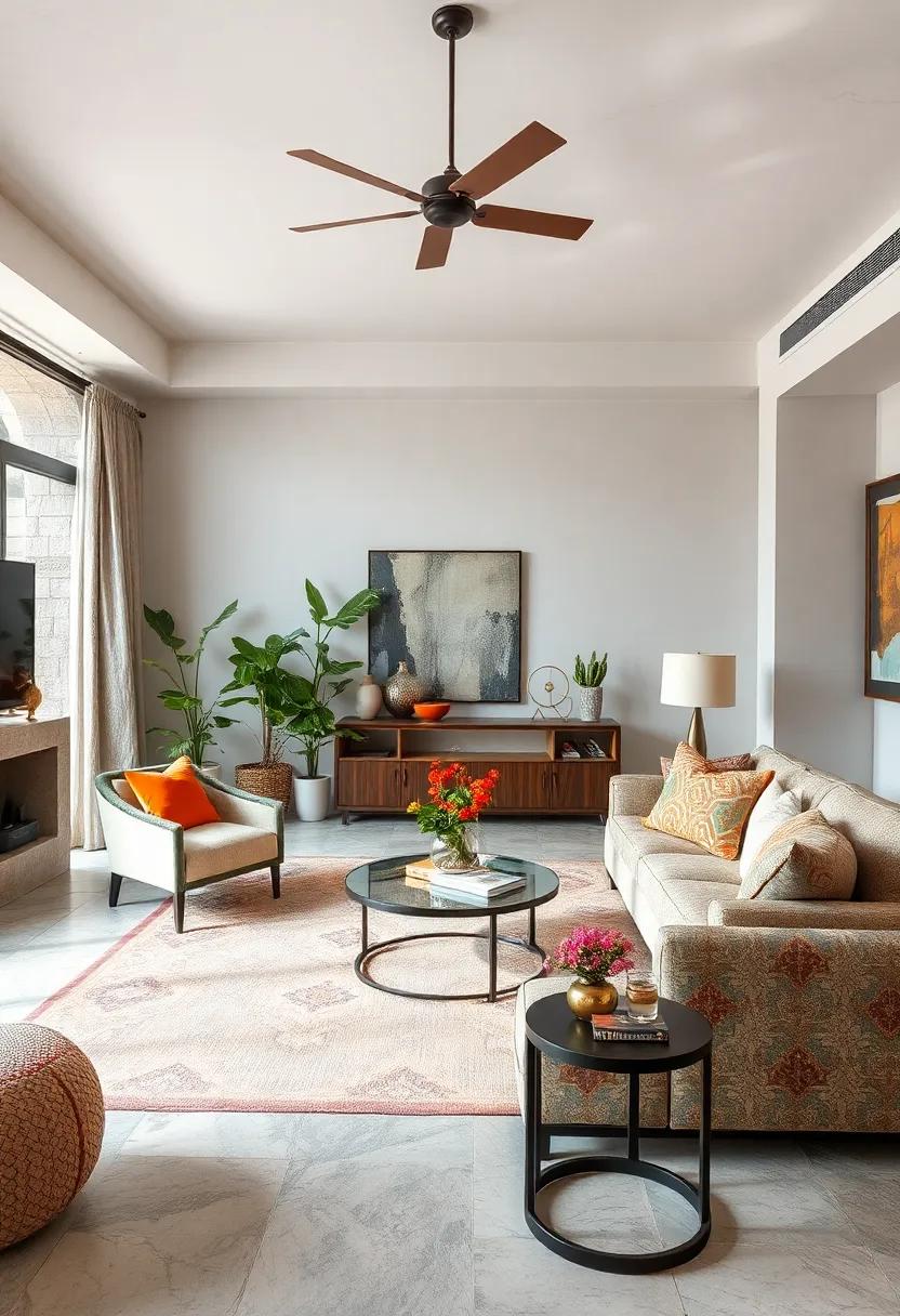 By embracing these softer shapes, you not only enhance visual interest but also create an inviting, serene atmosphere in your eclectic living room. Pairing them with bold patterns and eclectic accents establishes a dynamic aesthetic, inviting comfort and creativity into your space. The charming juxtaposition of the rounded and angular shapes helps to build a layered narrative, emphasizing the beauty of both forms within your design.