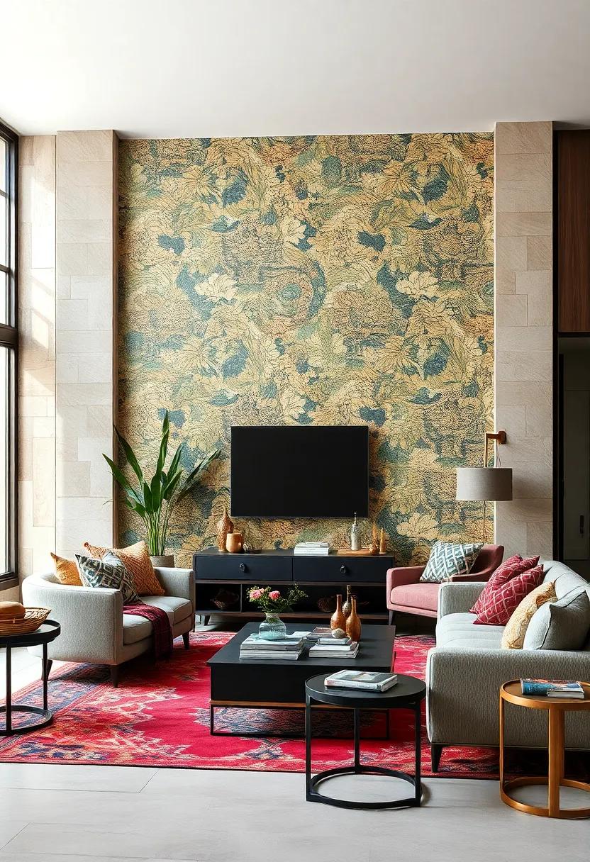 Bold Wallpaper Choices: Opt for an accent wall with vibrant, eclectic wallpaper to serve as a focal point in your living space