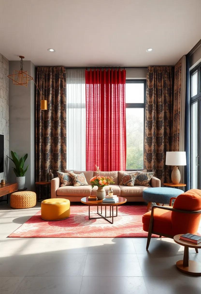 Combining contrasting colors with various textures can also elevate your window treatments. Consider mixing heavy drapes with lighter sheer fabrics to create depth while allowing natural light to filter through beautifully. A savvy way to showcase these bold curtains is by layering them with complementary accessories like colorful throw pillows or quirky art pieces on the walls. This synergy further enhances the overall aesthetics, giving your living room an inviting yet adventurous appeal.