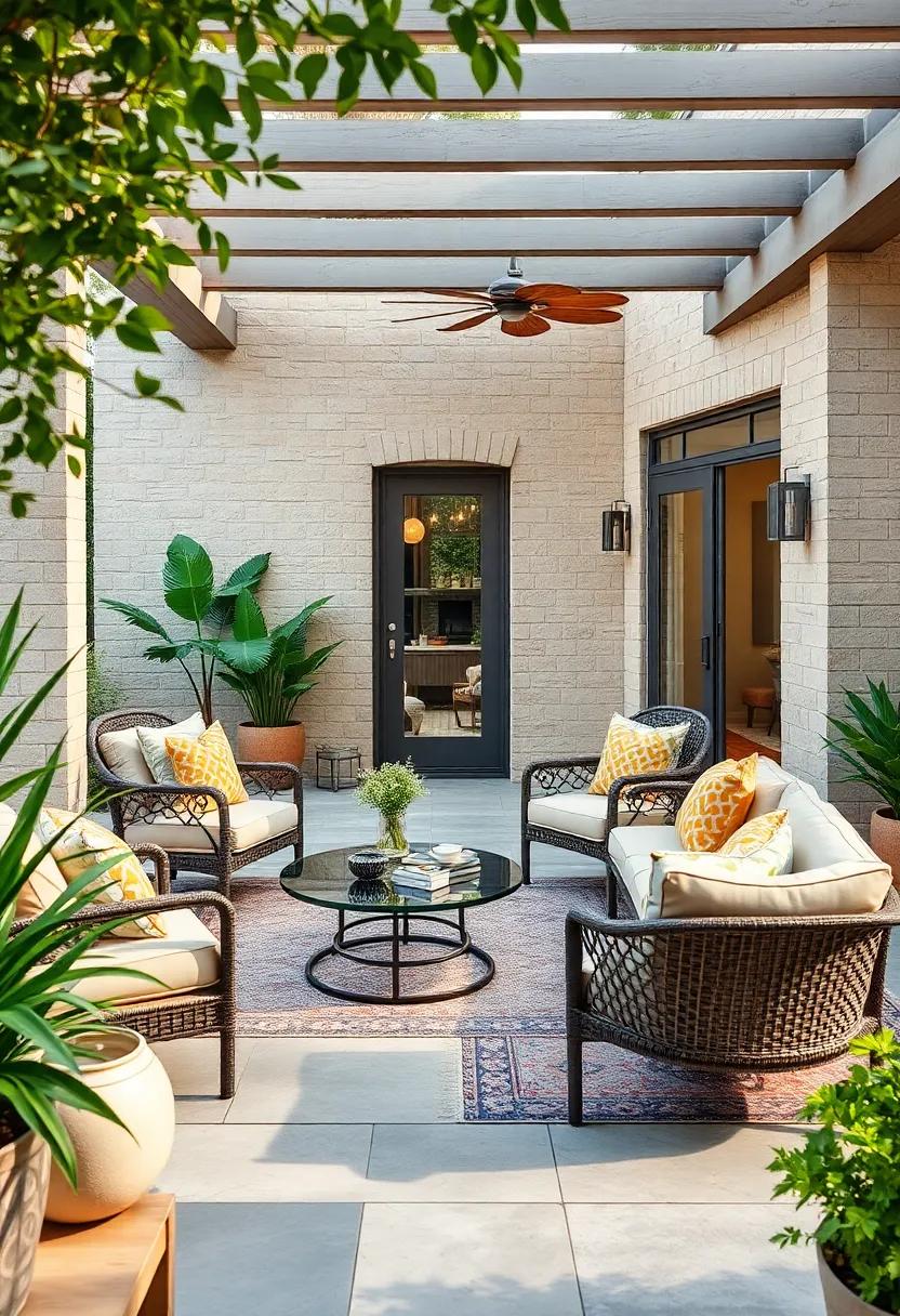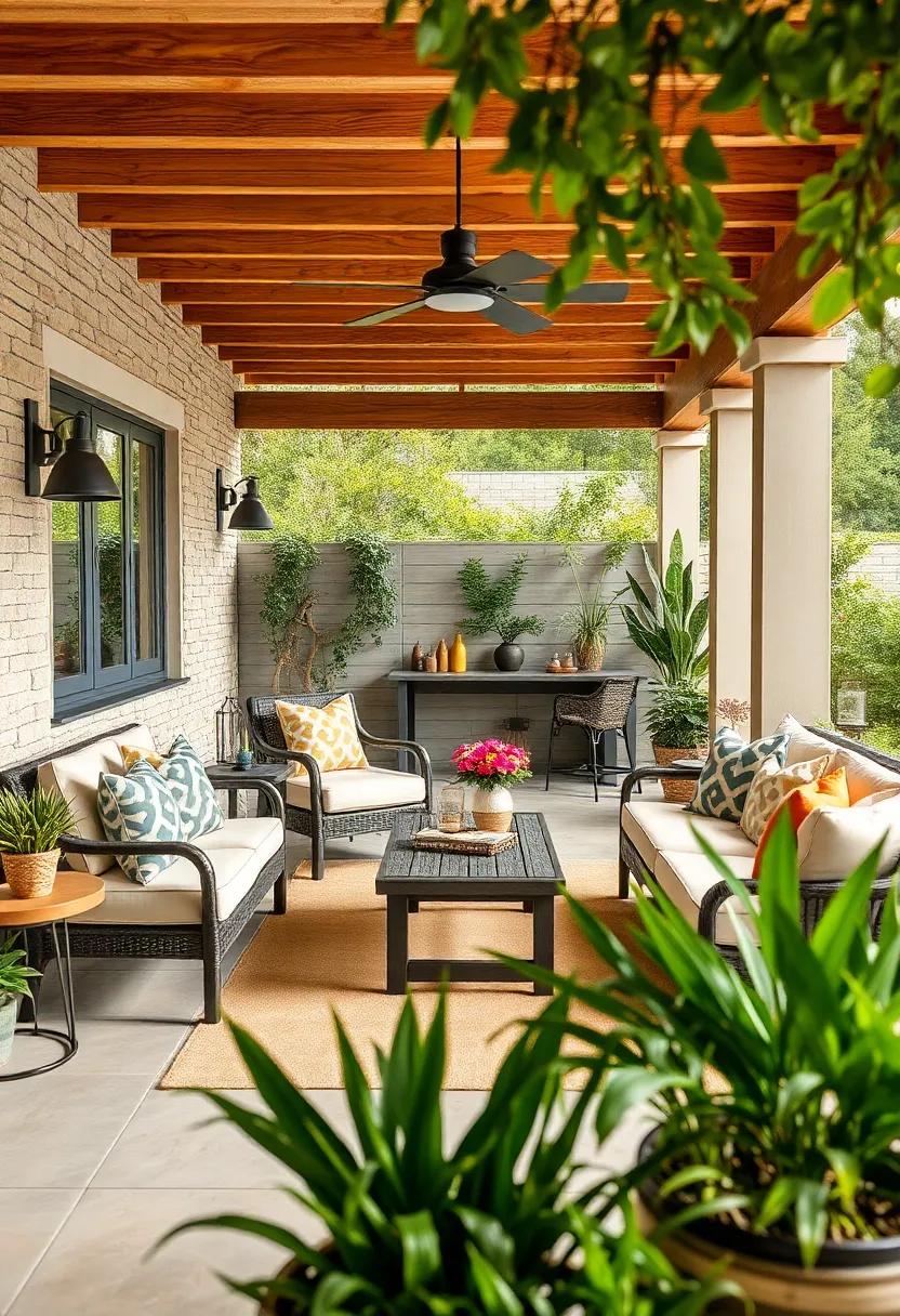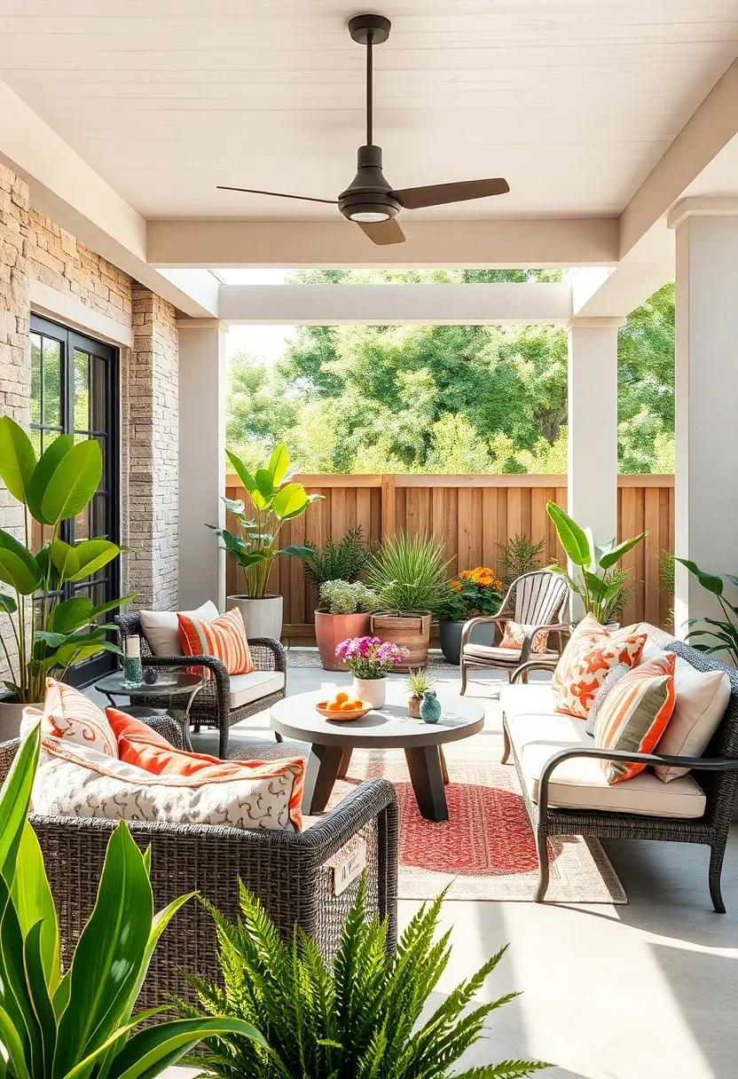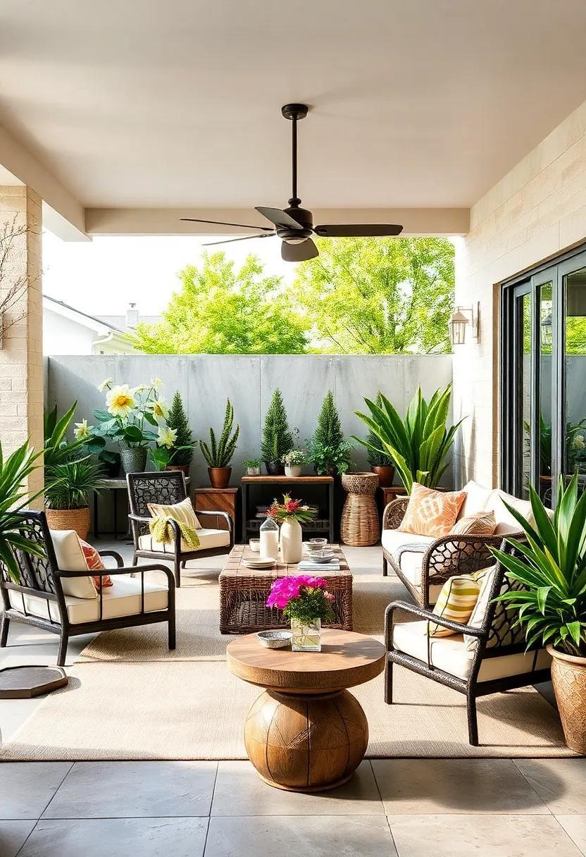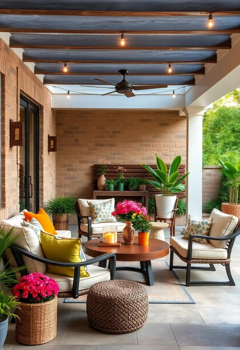 Transform your patio into a lush retreat with an array of vibrant cushions that beckon you to relax in comfort. Choose patterns that echo the beauty of tropical nature, such as radiant florals or bold leaf prints. Enhance the ambiance by incorporating lush greenery—think potted palms, ferns, and vibrant flowering plants—to bring that sought-after jungle feel. Arrange these elements around a tasteful bamboo lounge chair, which offers a perfect spot to unwind while sipping a refreshing drink. The contrast between the bright cushions and the natural materials will create a visually stimulating space perfect for lounging.