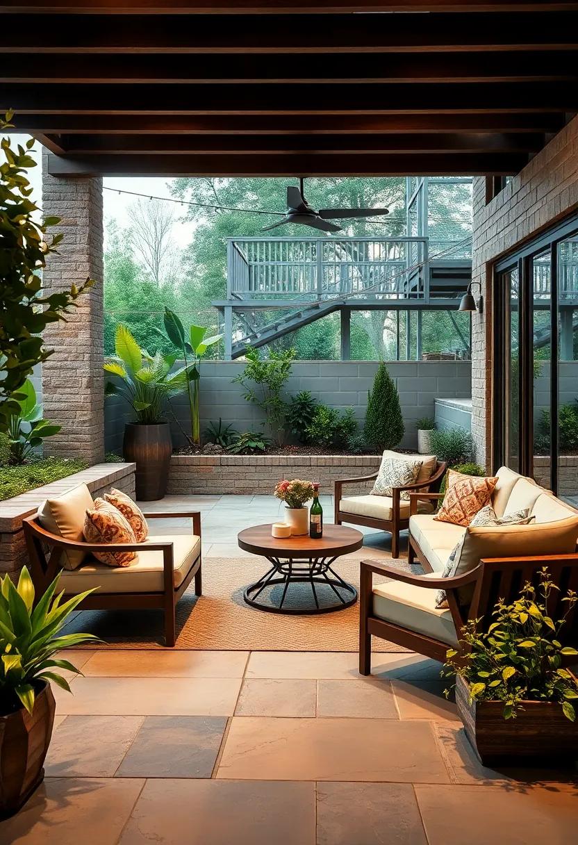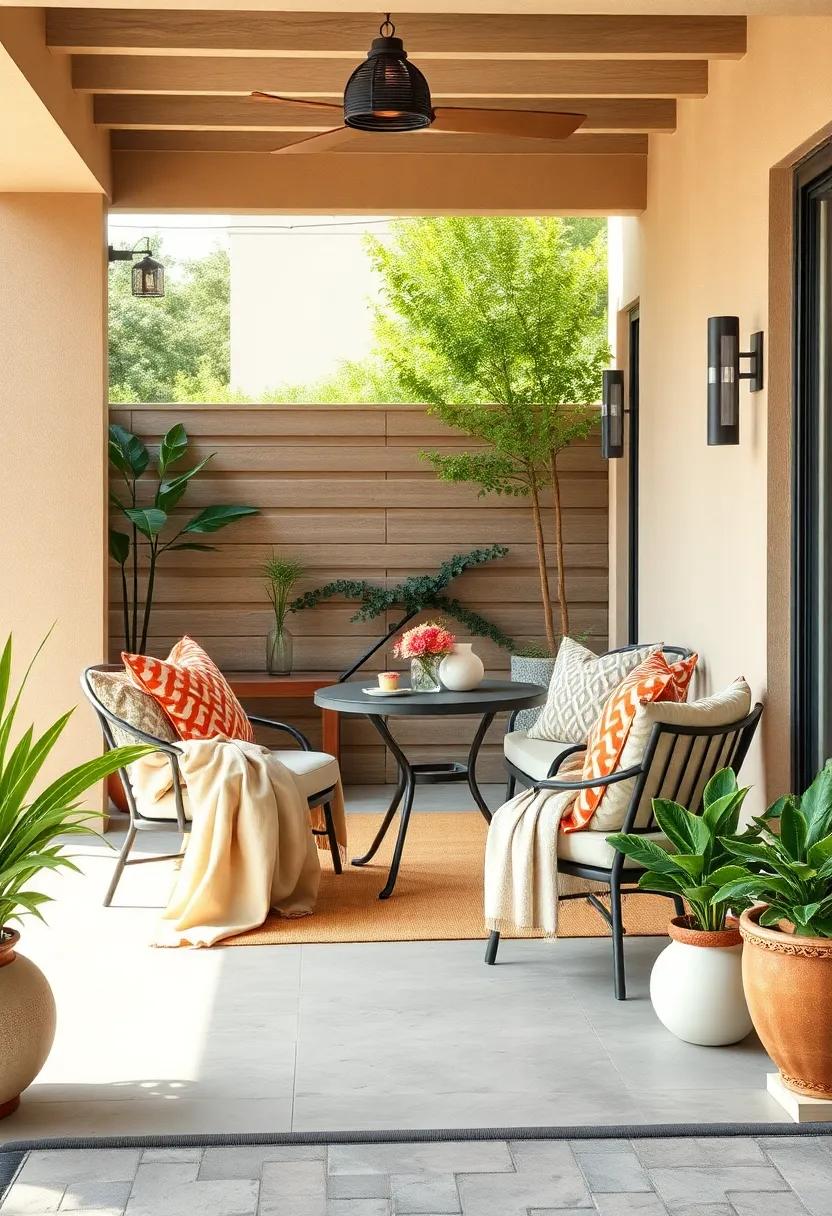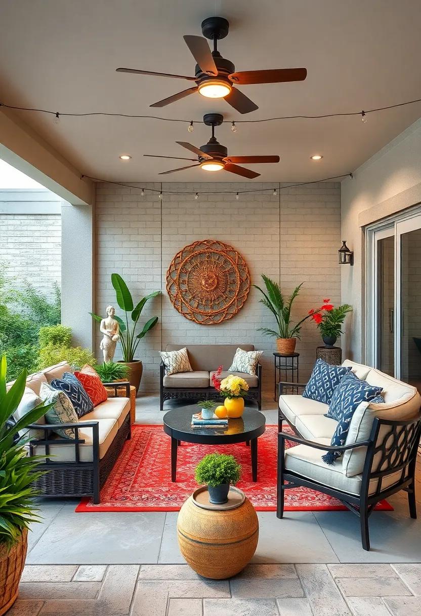 Transform your patio into a lively artistic retreat by incorporating unique sculptures and vibrant wall art. Consider placing a large, abstract sculpture as a centerpiece that draws the eye and sparks curiosity. Surround this artistic focal point with colorful furniture—think a mix of bright chairs and bold cushions—that complements the art and creates a cohesive look.A well-curated selection of plants or greenery can further enhance the visual appeal while creating a lively contrast against the artwork.