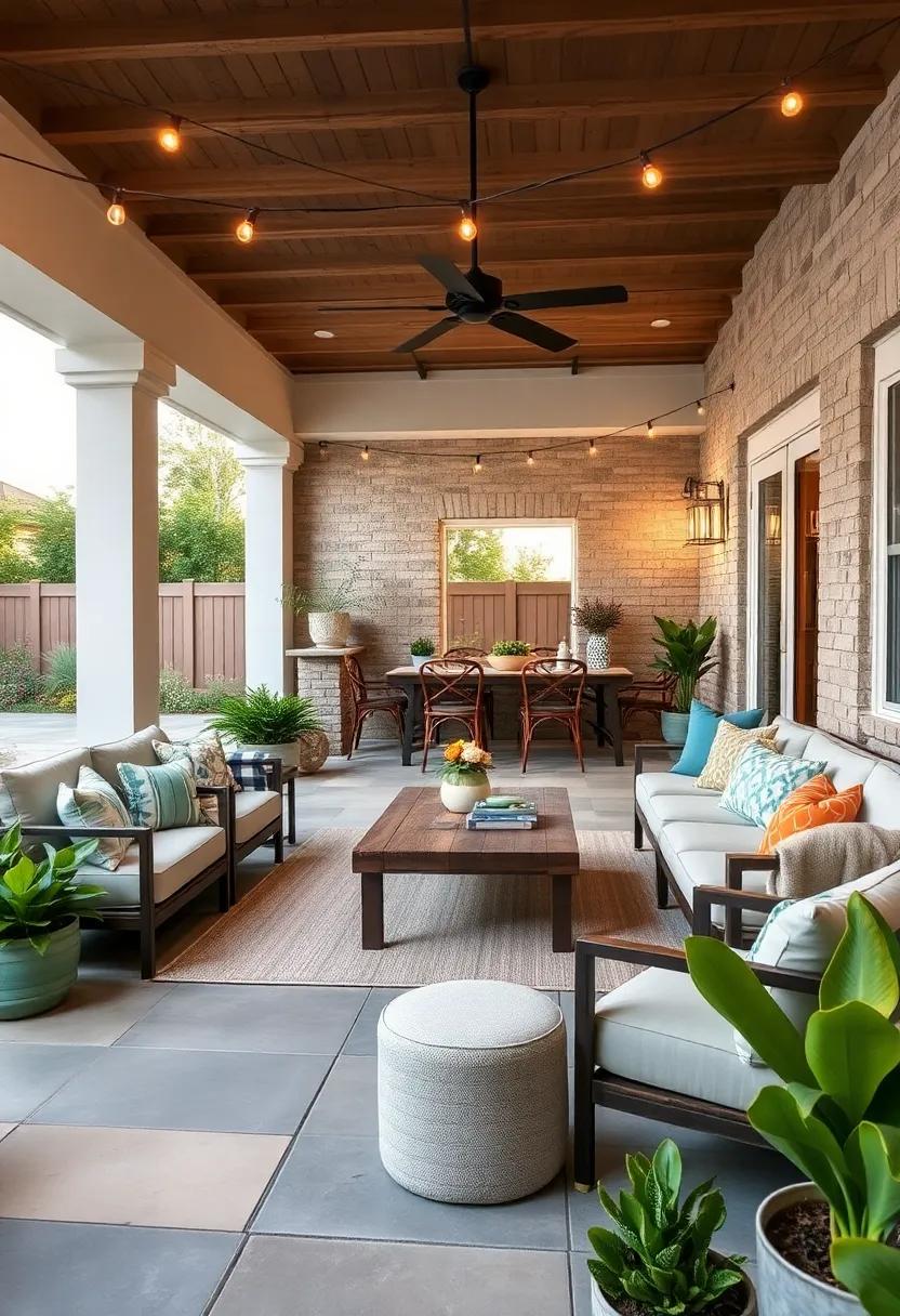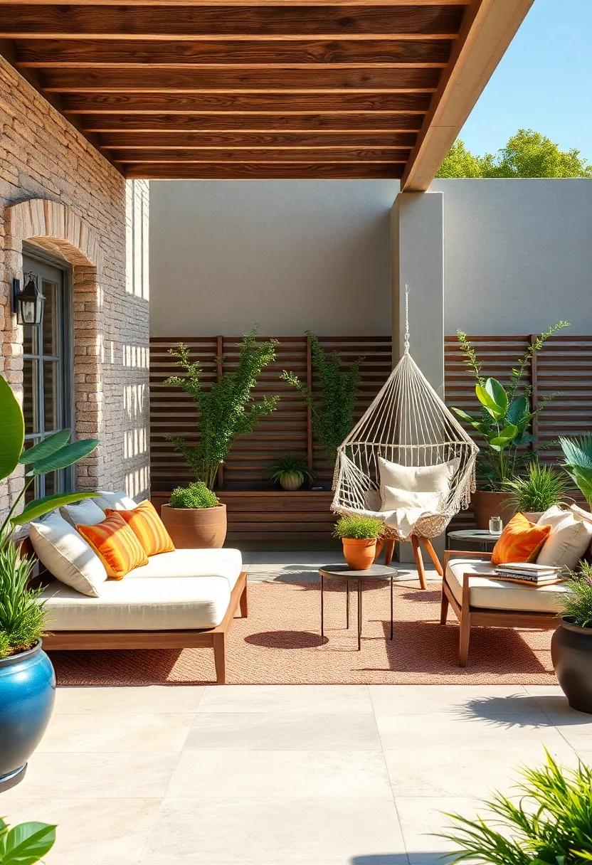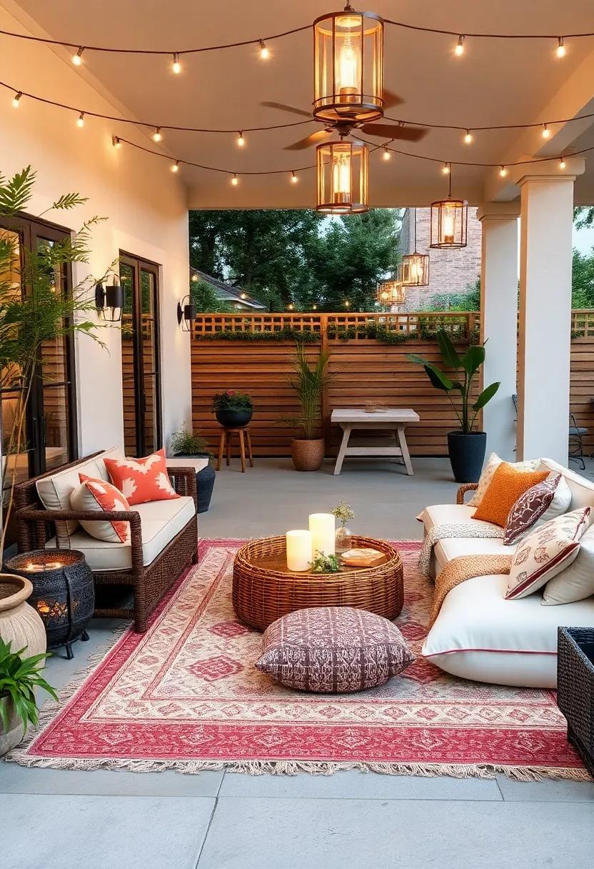 To really set the mood, drape string lights across overhead beams or along the patio railing, creating a twinkling canopy that invites long, warm nights outdoors. Pair this with a selection of hanging lanterns — think mismatched styles for an eclectic vibe or coordinated pieces for a more streamlined look. Integrating these lighting elements not only enhances the visual appeal but also adds a warm glow, making your bohemian chill zone perfect for evening gatherings under the stars.