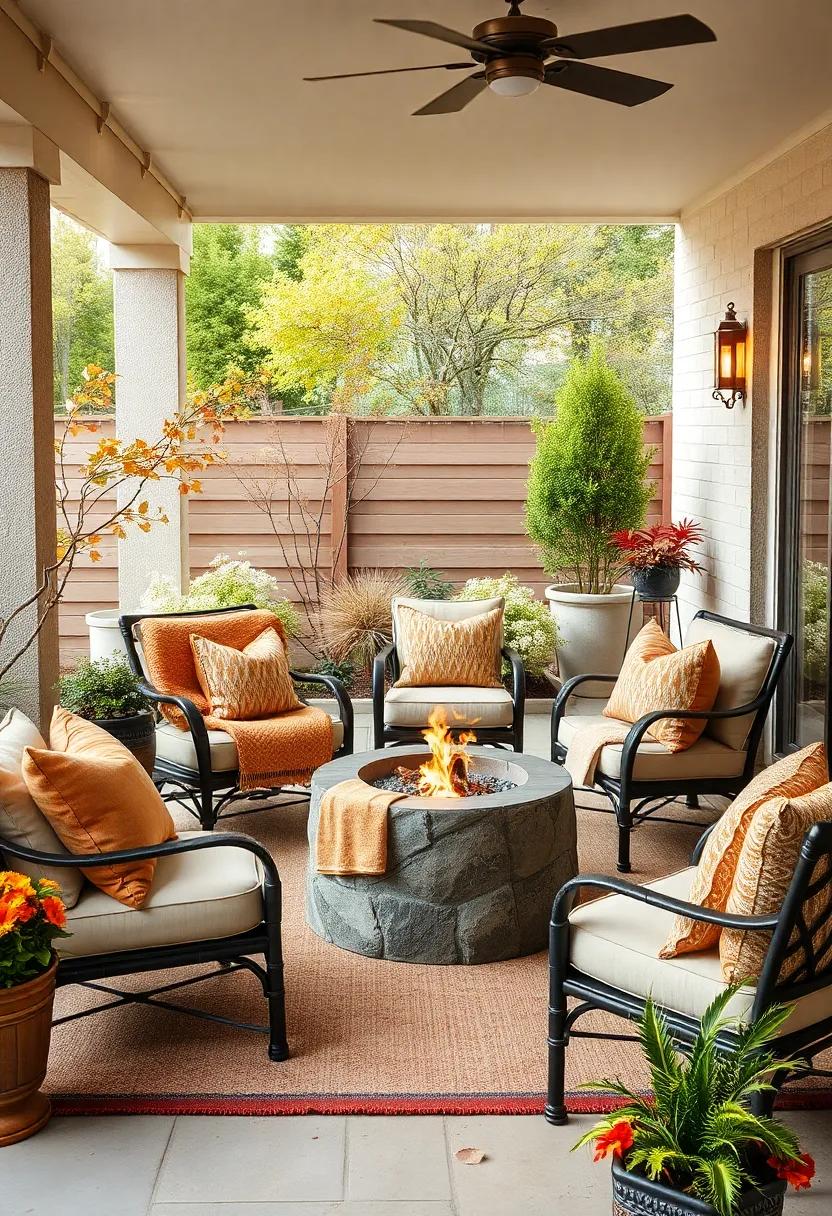Cool Autumn Retreat: Style your patio with warm,earth-toned cushions,throw blankets,and a small fire pit to embrace the beauty of fall in comfort and style